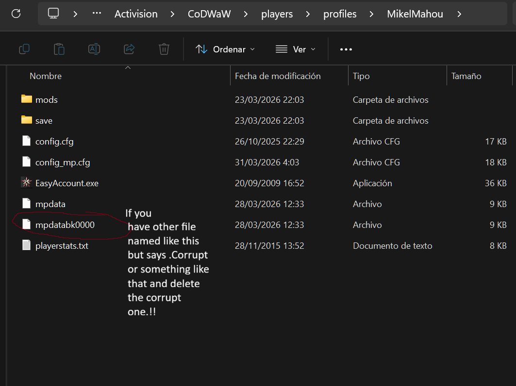2. Hello! Its much more simple fix this than you imagine. There are 2 ways to fix this: 1-Go to your profile player allocated somewhere like this if you are a non steam user: "C:\Users\mikel\AppData\Local\Activision\CoDWaW\players\profiles\MikelMahou" Where the profile is allocated in %appdata" hidden folder, that is currently in your user from Windows, in the route: (for example mine) "C:\Users\mikel" (From here locate the folder %appdata%/activision/codwaw/players/profile/yourplayerprofile) Inside that folder, you will see some like these files (check in screen capture i add) If you see a named "mpdatabk0000.corrupt" file, just delete that one. Then return and open the game, go to Main Menu, then go to refresh ALL SERVERS and check ALL GAME MODES are Checked, then do a new update/refresh servers and then go to your FAVORITE SERVERS, Do same, push the refresh button and check all again. Solution 2: The Punkbuster issue that delete favorites. Sometimes enable/disable the PB have some funny issues in the refresh list of servers., As much for Global Server List as for Favorites Servers etc. This is due a conflict generated when you sometimes got an internet issue, a server disconnect or lose too much pakects issue when you play. To solve this: Solution 2 2-Go to Main Menu, in game, go to PUnkbuster Section. ENABLE Punkbuster, Then Refresh ALL List servers. Then return Favorites Servers, Refresh ALL. Check. Sometimes, is just a corrupt file, what lets search and favorites in a way looks is block or lose, but is just cause sometimes, t7his makes a conflict with your actual config in game settings, or cause due a malfuntion of server conection, or you ISP fails and you got disconnected in some server etc, that made the .corrupt file appears in your config and that broke the system to keep favorites, progress in servers etc etc. Always, do a PROFILE copy from the Activision Folder located in %appdata% and keep it save place when is working fine, or you did some progress in game or servers etc, in that way you will be always able to backup your profile if this happens again or you miss some in the way cause an error, etc etc- Some alternative checks you need to do: 1-check ALWAYS you are in same network, LAN or WIFI, but the same, not get the both connected at same time, that can make conflicts and then this happens. Is better you always if possible plays in LAN connection mode. Wifi adds Input Lag and have mostly, packet loss in game. Lan cable is better for gaming. No doubt. 2-Do a Flush DNS in CMD. Open CMD as admin and type: ipconfig /flushdns Clean Nvidia Chache (if you use Nvidia Video Card) Press Windows + R then type %localappdata% And then look for NVIDIA folder, open it , look for DXCache and GLCache Folders and delete them! then look same directory for NVIDIA Corporation > NV_Cache and delete this one too. When all is done, remember do a restart pc, the go the game, open it and must be all ok. Let me know how is going and if you still have issues. Mikel me files like this: Then open your profile player,