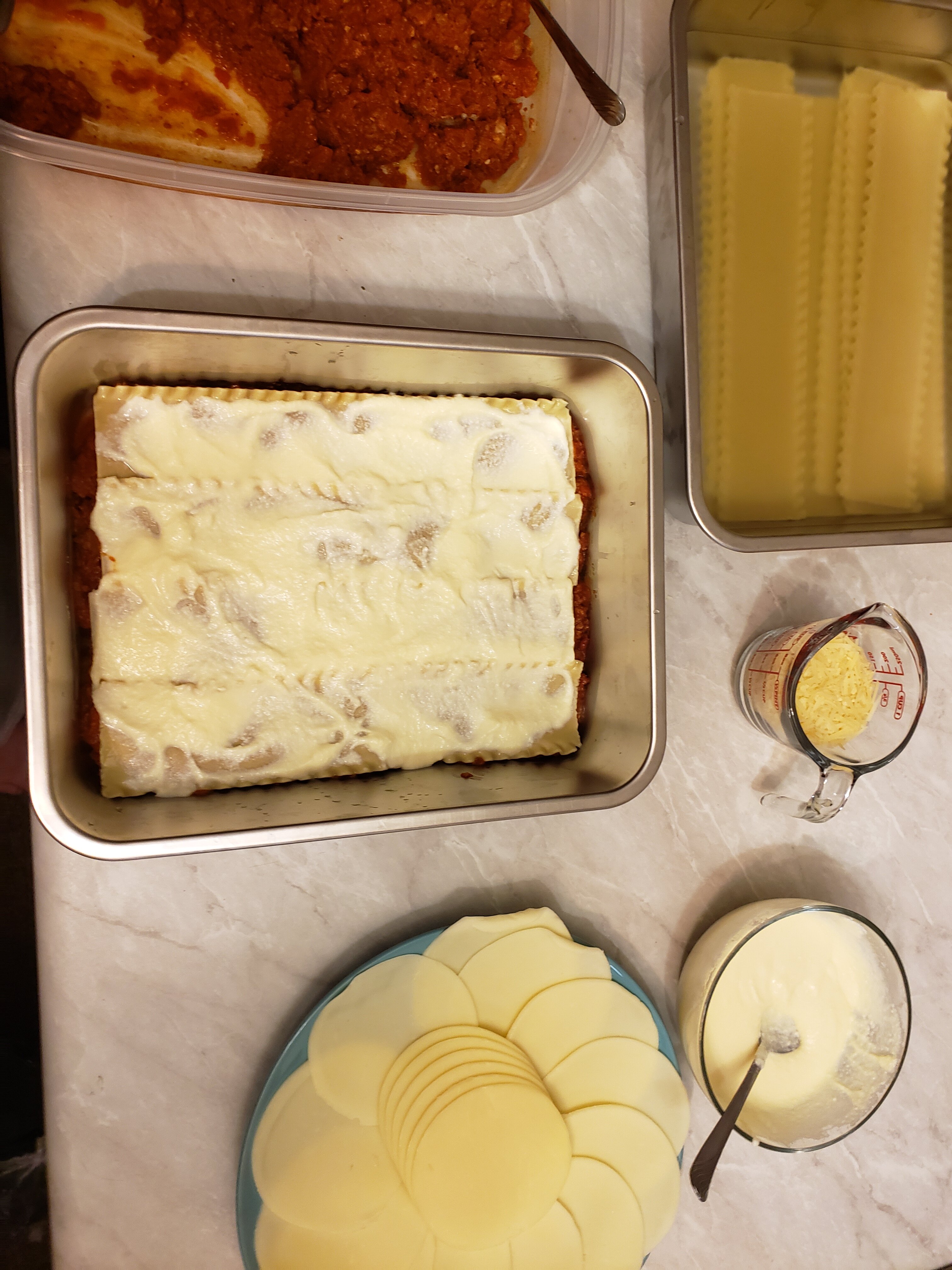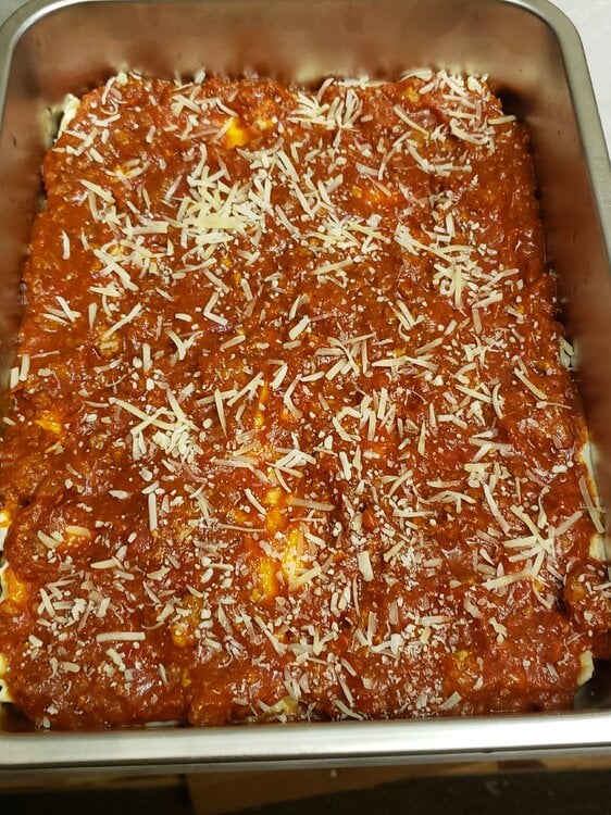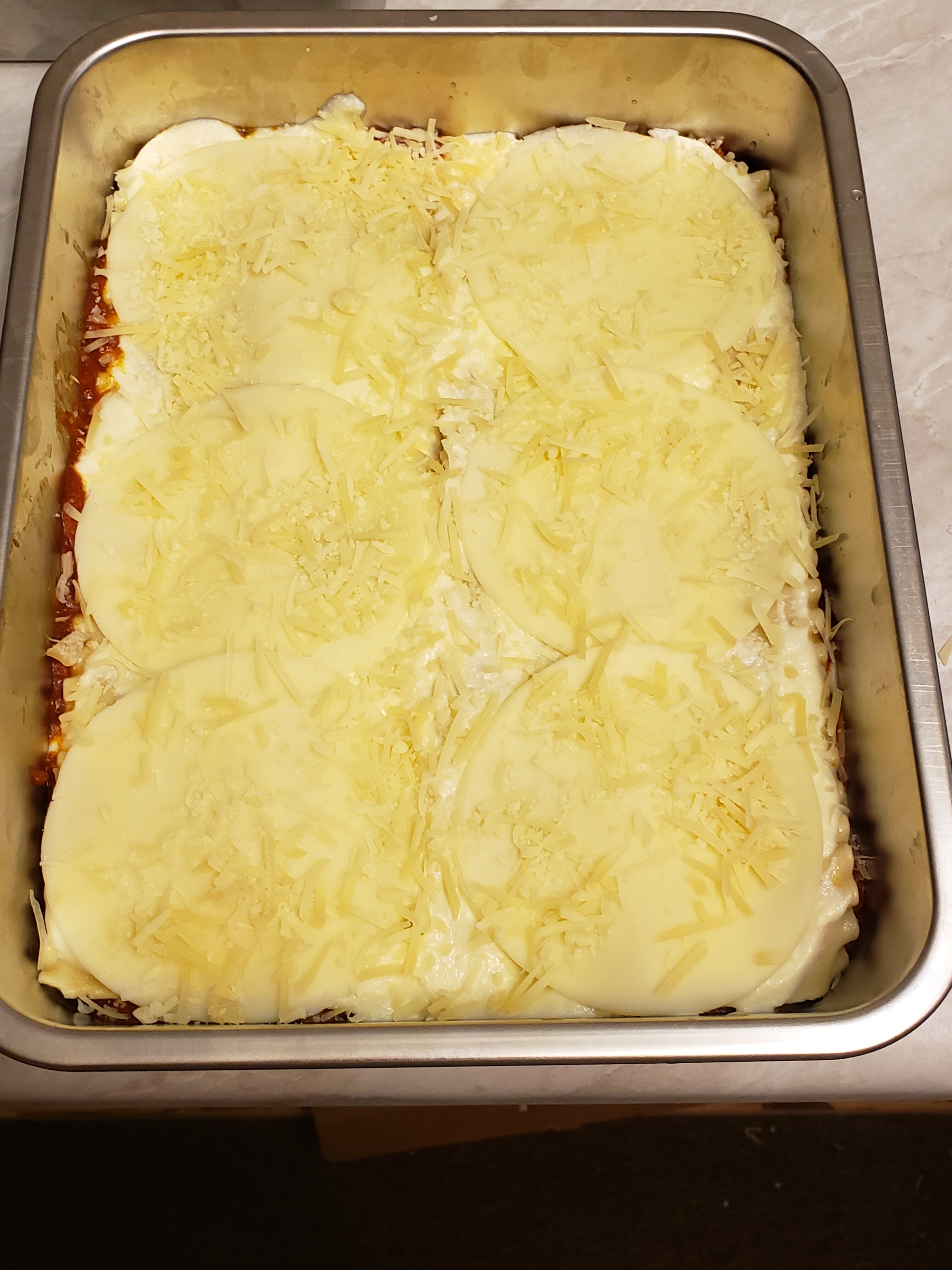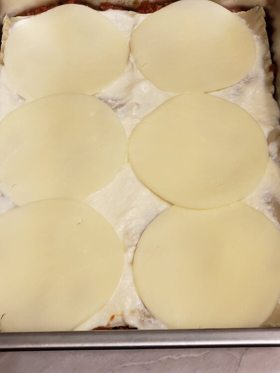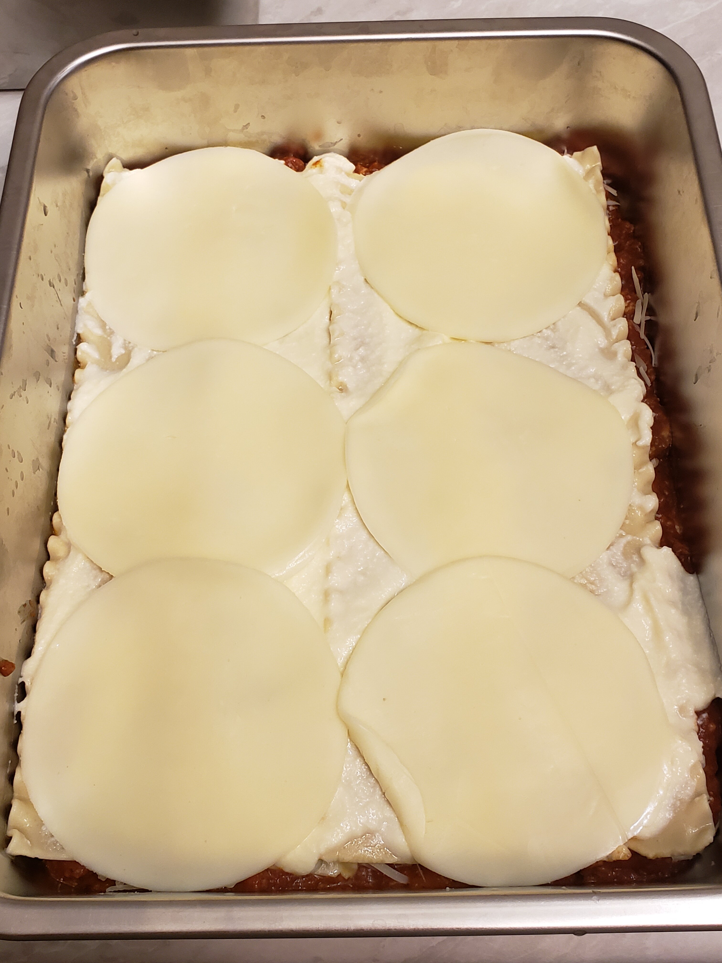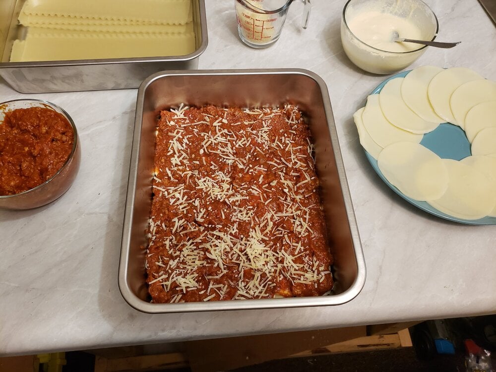 Meat sauce, noodles, ricotta, mozzarella; meat sauce, parmesan, noodles, ricotta, mozzarella; meat sauce, parmesan, noodles, ricotta, mozzarella, parmesan.