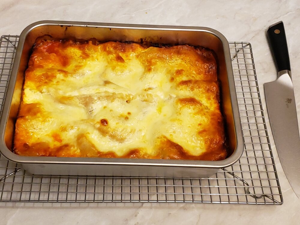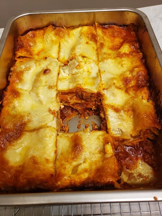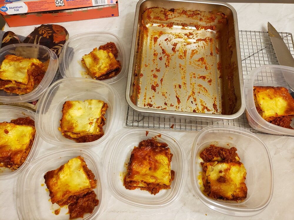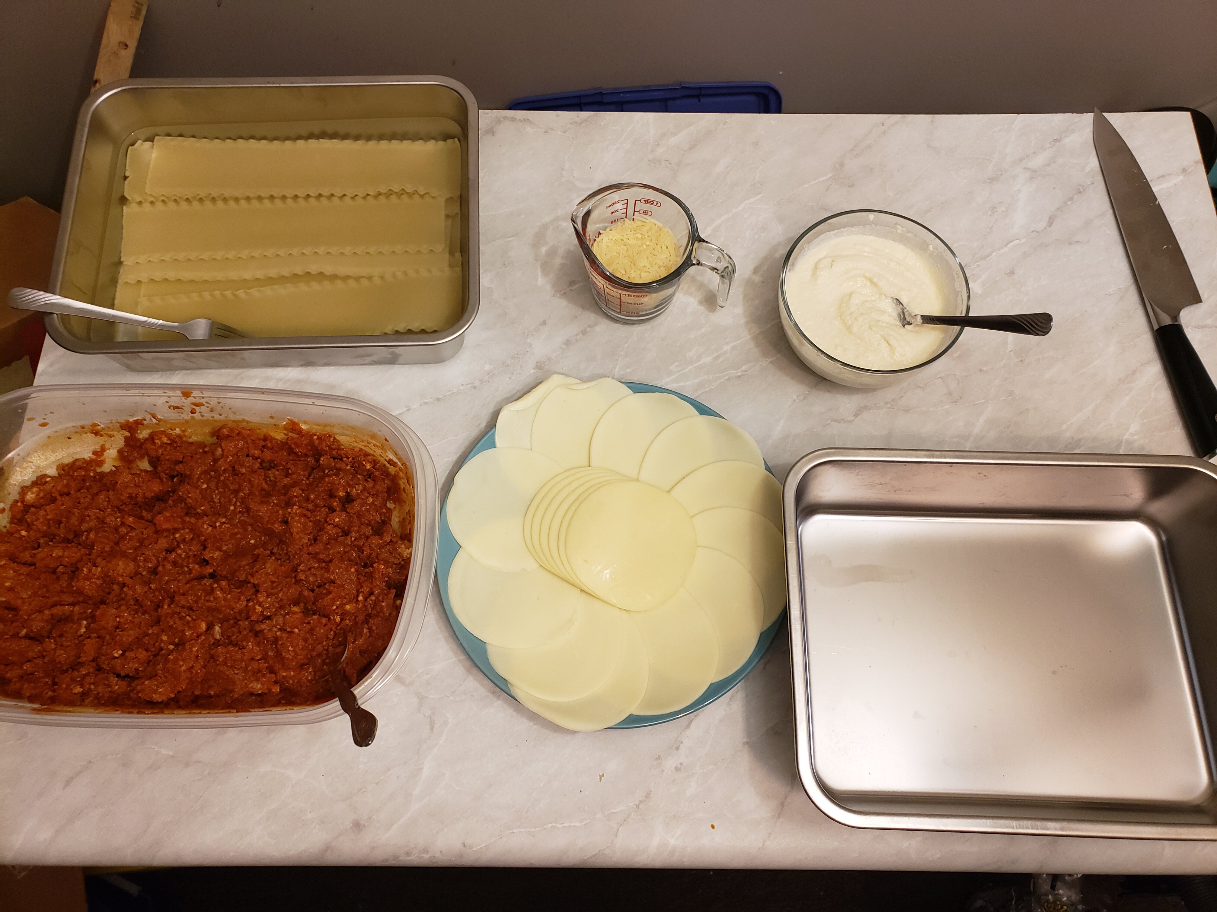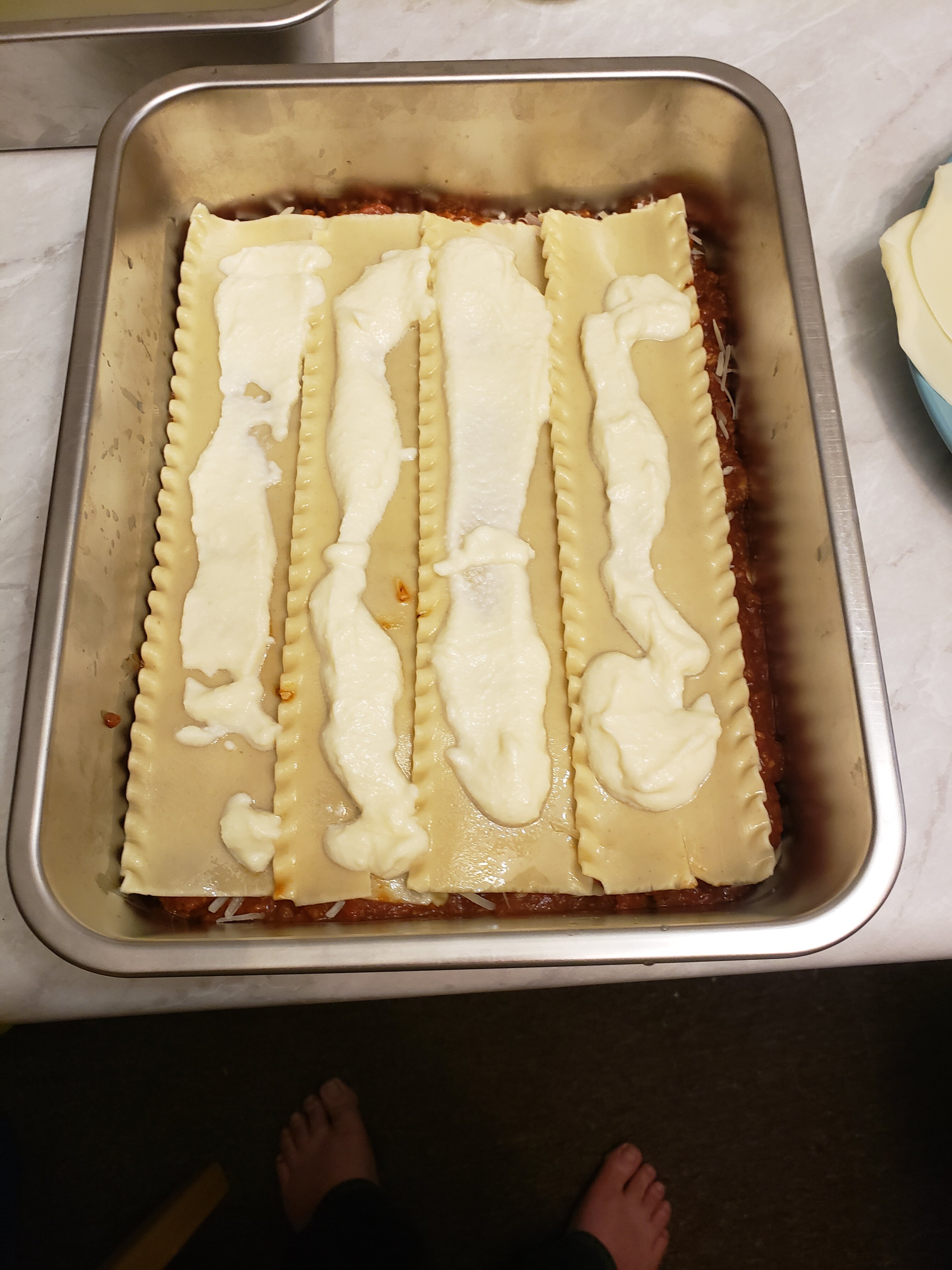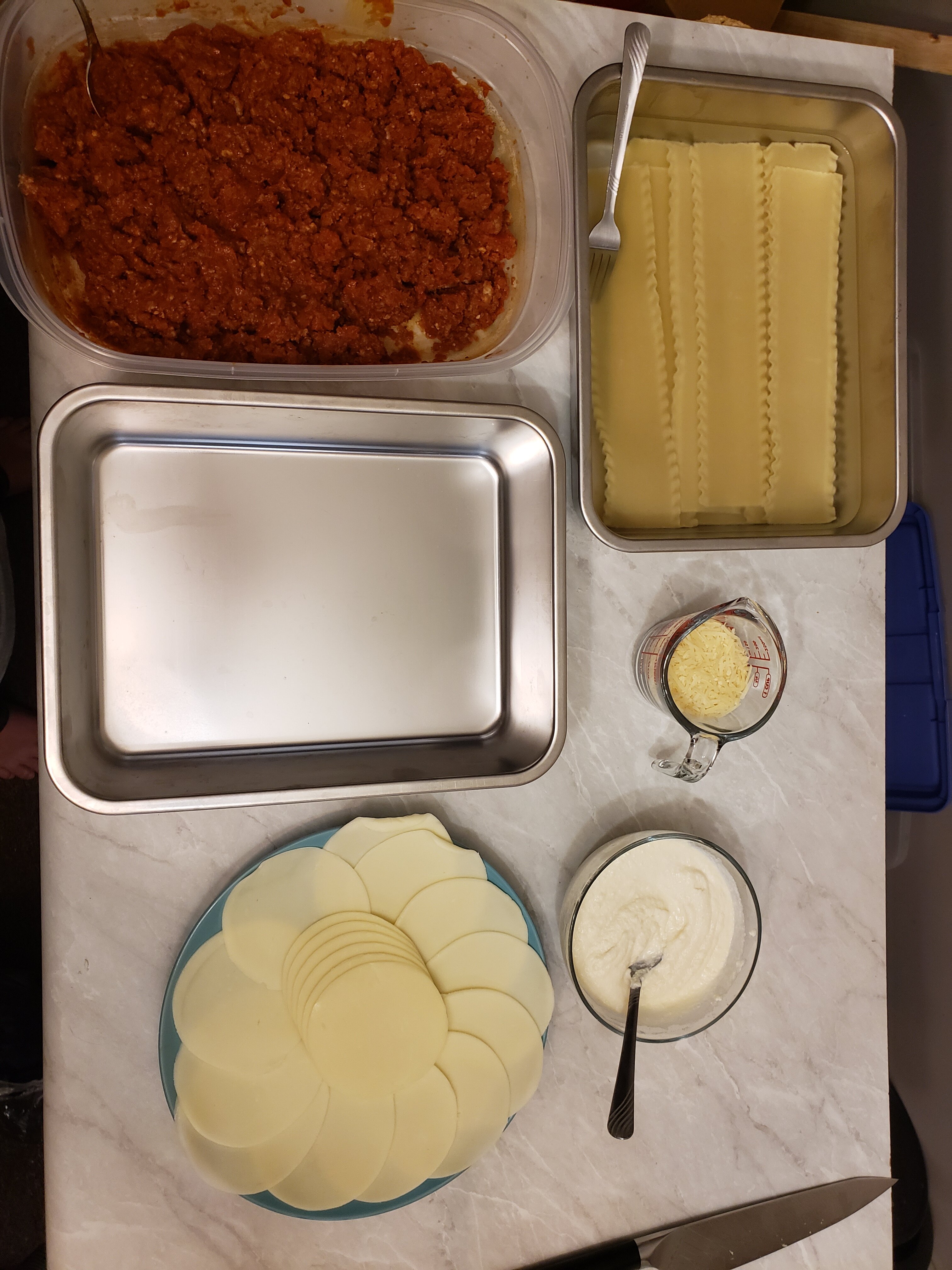 Meat sauce, noodles, ricotta, mozzarella; meat sauce, parmesan, noodles, ricotta, mozzarella; meat sauce, parmesan, noodles, ricotta, mozzarella, parmesan.
