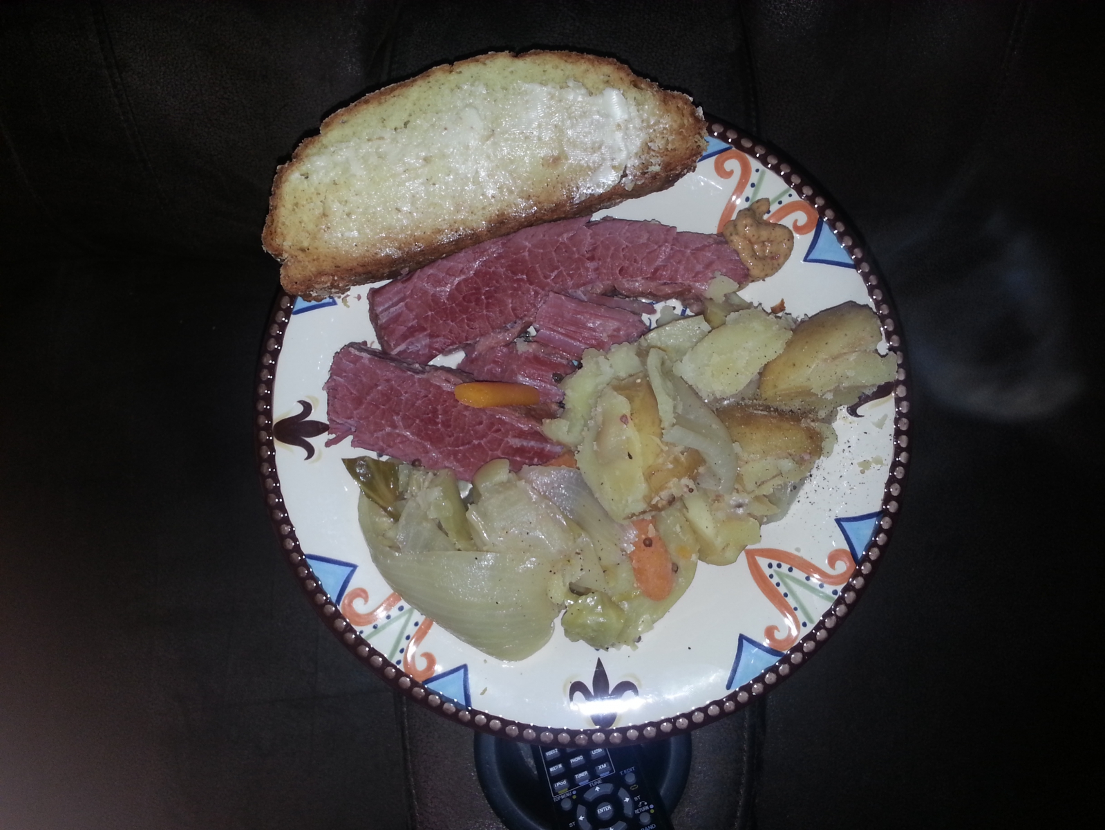 Soda Bread (I made it from scratch), Corned beef (I cured it, complete with saltpeter), & veg.