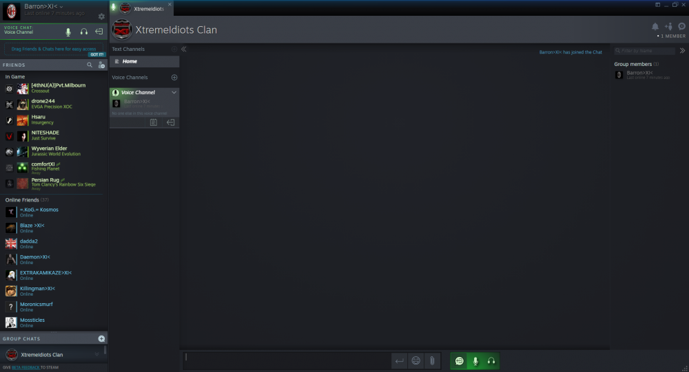 Actually you dont need to setup groups if your apart of one already. I clicked on the XI Steam page there and it was already there. The Administators for the group would have to setup channels I presume Moderators can setup Text Channels as I was able to do on the XI Insurgency group , so it will be the main Admistrators of the group that can setup extra voice channels1 point -