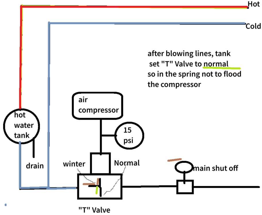 yes winterize your cabin. trailer, RV with windsheild wash -40°c ( PVC is resistant to many alcohols, fats, oils and aromatic free petrol. It is also resistant to most common corroding agents including inorganic acids, alkalis and salts. However, PVC should not be used with esters, ketones, ethers and aromatic or chlorinated hydrocarbons) and air compreessor that will connect to water inlet turn off water and disconnect water connnection than add air compressor to plumping side with a regulator set to 15 Lbs, presserize system. start open hot taps that are near compressor and work your way to the longest tap, then hot taps: and close all hot taps if nothing comes out, open drain on hot water tank flush the water remaining in tank by close valve/open valve( by build up pressure then open valve on tank drain till air comes). toilet flush it and open / close to drain water from lines after that go fill all sink traps, drains and toilet with anti-freeze. all set for winter and ready to go in the spring. Note Diagram for permanent set up can use a 12vdc or 120vac compressor and with a "T" valve to keep water out of compressor more safer for a check valve may leak1 point -