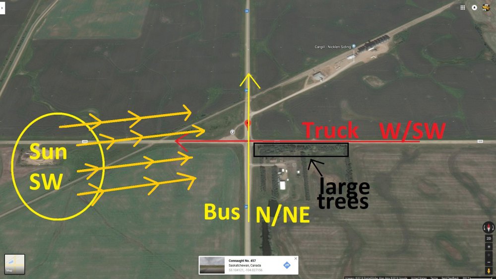6. That really sucks. But they should not blame the truck driver. It wasn't either drivers fault. If you look at where it happened and where the sun was at the time and everything it's easy to see why it happened. If the Sun was in the truck drivers eyes he HAD to be going west and it happened Friday evening so the sun would of been in the W/SW. And a bunch of thick trees to the left of the truck and right of the bus coming up to the intersection so neither one of them could possibly know there was traffic coming the other way untill it was to late. google maps link to the crash site https://www.google.com/maps/@53.1031634,-104.0265512,3a,75y,358.49h,76.07t/data=!3m6!1e1!3m4!1s4IjsSsjKDZNR69GawsWfTQ!2e0!7i13312!8i6656?hl=en Made a generic map overlay. It explains alot. Just a really bad spot at that time of the day and with the blinding light of the sun hitting the snow it would be impossible for for anyone to see a little stop sign in time. And with those trees well you get the picture.