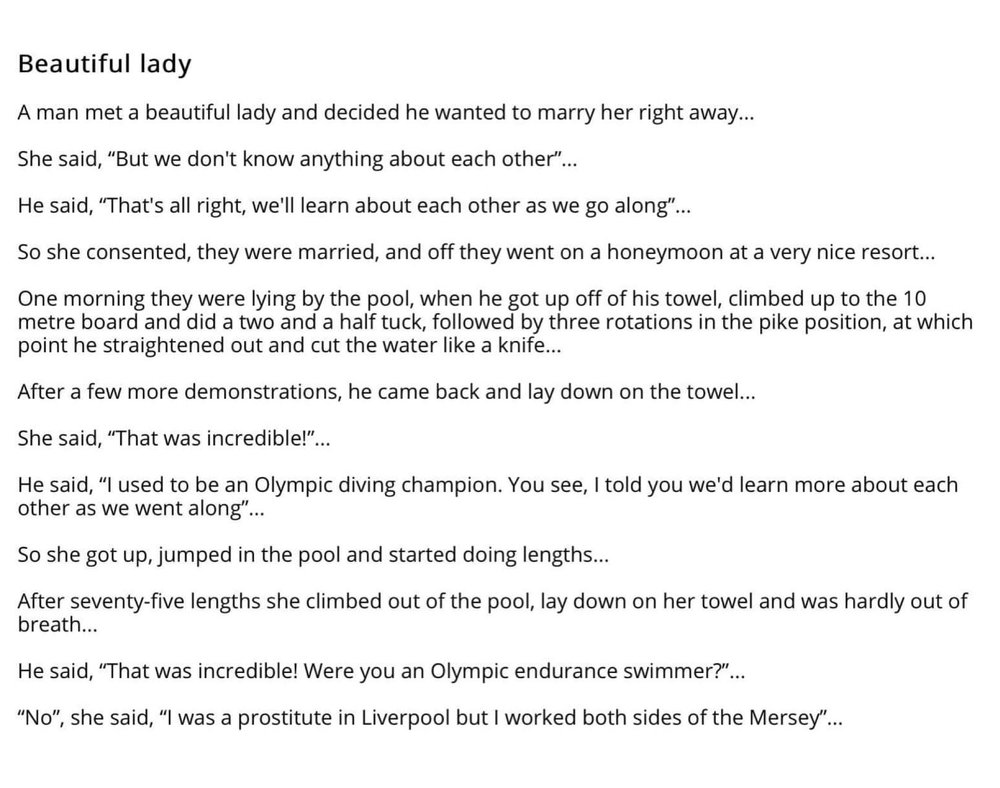 Vaseline A man doing market research for the Vaseline Company knocked at the door and was greeted by a young woman with three small children running around at her feet. “I’m doing some research for Vaseline. Have you ever used the product?” She said, “Yes. My husband and I use it all the time.” “If you don’t mind my asking,” he said, “what do you use it for?” “We use it when we make love,” she said. The researcher was a little taken aback. “Usually people lie to me and say they use it on a child’s bicycle chain or to help with a gate hinge. But, in fact, I know that most people do use it for sex. I admire you for your honesty. Since you’ve been so frank so far, can you tell me exactly HOW you use it?” The woman said, “I don’t mind telling you at all. My husband and I put it on the doorknob and it keeps the kids out.”