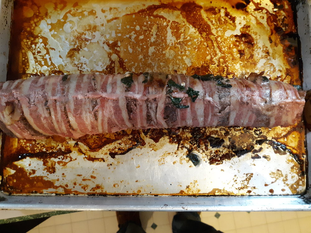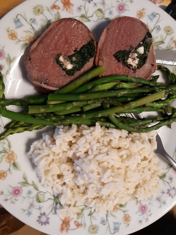 2. i thought i posted this before? i guess not though, i couldn't find it... yep going nuts i guess! i sauteed shallots, fresh spinach, spices and white wine... stuffed the tenderloin with that and feta cheese then wrapped it with bacon cooked it med rare. served it with asparagus and rice, both cooked Al dente, along with a glass port wine, not shown lol... i could have posted this on someone else's post? still crazy after all these years LOL!