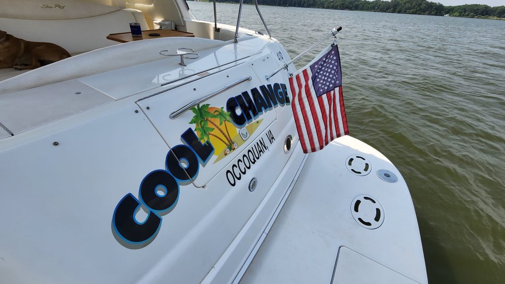 22. It's been a busy week with Cool Change. She got lettered finally. My wife and I (and the dogs) spent most of the weekend scrubbing, cleaning and shampooing the carpets. I think we scrubbed several layers of skin off our hands and fingers. But she is starting to look really good. Still have along way to go, though. We had a chance this afternoon to drop the anchor in our favorite cove and just chill and enjoy a libation....or two.