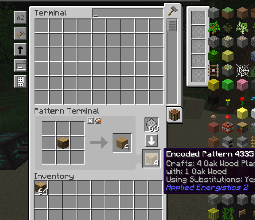 I thought I'd make a short post about features within the best mod Applied Energistics 2 (AE2). Having seen some people ask about how you automate the ME system I feel like giving a short post to help people new to the mod. What you'll need for this at start is a basic ME system. The items you are going to need for this is ME interfaces, Molecular assembler, cables, ME Pattern Terminal, an ME Interface Terminal will make it easier but is not necessary, Crafting Storage and Crafting Co-processing units, a crafting monitor is optional. Two basic structures are needed to be built for this, these are the CPU itself and the crafting chambers. Part of the CPU are Crafting Storage of chosen size and Crafting Co-processing units as well as a crafting monitor. Putting these blocks together in a solid cube will cause the CPU to form, the same is true by only using a single Crafting Storage. The crafting storage determines how big of a project the CPU can handle. More crafting storage means bigger crafting recipes. So if you're only able to make 10 sticks per time, adding more crafting units can increase it to for example 200, this doesn't change the speed of the process. By adding Co-Processing Units to your CPU you will be able to perform tasks simultaneously within the recipe. Say you're making sticks. You need to craft the logs to planks and the planks to sticks. By adding 1 Co-Processing Unit you can now craft sticks from planks before all logs have been turned into planks. Each Co-Processor unit allows for 1 additional task to be crafted within the recipe. They are also responsible for how many molecular assemblers you can utilize for a recipe. If you have multiple Molecular Assemblers attached to an interface with the recipe each Co-Processing Unit will increase how many Molecular Assemblers can be used at once. So then moving over to the Crafting Chambers. It's in your Crafting Chambers which all the crafting will take place. By attaching a Molecular Assembler to an Interface you will be able to start crafting stuff. Add the recipe you want into the interface and once requested to craft it will start crafting inside the Molecular Assembler. You can put up to 6 Molecular Assemblers on your interface, thereby enabling crafting to take place in more Molecular Assembler than 1. But as mentioned earlier, this will be dependant on how many Co-Processing Units you have available. In order to make patterns to put in your crafting chambers you need the Me Pattern Terminal. It's in here which you make recipes into patterns that are placed in interfaces. The ME Interface Terminal helps you out by showing you the content of all the interfaces. This makes it much easier to keep track of where every recipe is and you can put patterns into interfaces in this Terminal rather than running around finding the best choice. So how do you actually do it? First of all stick to the "no connections crosses chunks" rules. Do not connect AE2 stuff over chunk borders or you risk having items disappearing. You should probably also add an empty biometric card with build permission into your security station, as this can prevent the cross chunk bug. Be realistic when you think about how big you need to build things. Here are some examples of CPUs Here's how it looks like if you add the Crafting Monitor to the CPU multiblock. You could go really big with your CPUs, but the question sorta becomes "Why" pretty quickly. Having the capacity to craft 2'000'000'000 cobble into something else in one order is pretty meaningless. For cobble that should never be a thing anyhow, but for other stuff you often get by crafting lower volumes. You want to think about the balance between Crafting Storage (Cyan/blue in this image) and Co-Processing Units. The more Co-Processing Units, the faster you can craft. This is where the Crafting Chamber and CPU can bottleneck each other. Being able to craft 100 things simultaneously is not going to make anyone happy. Connect the CPU to your ME system with cables. These are some examples of Crafting Chambers: The middle one is most basic allowing each pattern in the inscriber to be crafting in 1 molecular assembler. The one on the left has 3 molecular assemblers connected to each interface allowing for a recipe to be crafted simultaneously in 3 places. This design however will share all the growth chambers between the interfaces, so if 1 interface has a pattern for stick and the interface down to the left has a pattern for planks the molecular assembler they share will only be able to chose one to craft. Behinds that you see an interface covered on all sides with molecular assemblers, leaving it with 6 of them. For the pattern recipe in the interface to be able to use all 6 you need to have 5 co-processing units in the CPU. This is very effective and therefore also better at creating lag. The last one to the right uses a dense cable in the middle, two interfaces on opposite sides, then the layer above has it rotated 90 degrees, molecular assemblers are then put on each side of the interfaces (you can exclude the side facing outwards for it to be more compact). This design combines size taken up by the Crafting Chamber with access to growth chambers. 1 interface uses up 1 channel, it doesn't matter how many Growth Chambers are attached. By adding Accelerator cards to the Molecular Chambers they will be able to craft much faster. Don't overdo it. Upgrading one Growth Chamber will only affect the speed inside that Growth Chamber. This is how the ME Pattern Terminal looks like: Put this where you want. Add Blank Patterns to the right slot, then when you've got the recipe you want to craft, simply press the arrow below the blank patterns and you'll have your pattern for that recipe. Next to the X by the crafting grid is what looks like an iron ingot, the way it looks now tells your ME system that for this recipe, matching ingredients can be used to replace what was initially in the recipe. Say I were to 