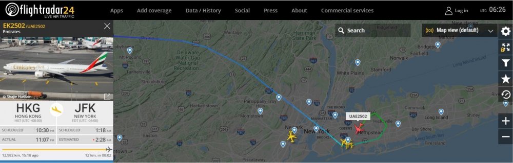 Sammy ... live flight RADAR screenshot of a UAE (Emirates) passenger flight from Hong Kong coming into NYC at about 2:25 a.m. EST.