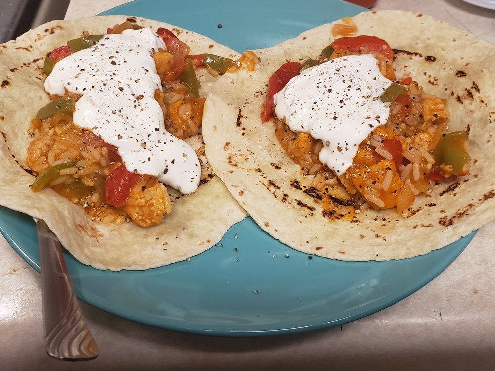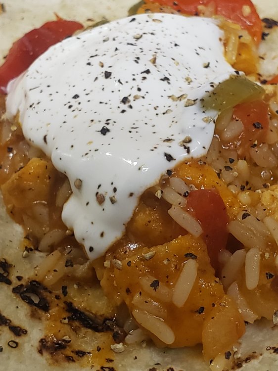Sautéed yard bird, rice, bell peppers, red sauce, tortillas heated on electric stove element... & a cat almost as fat as yours truly...