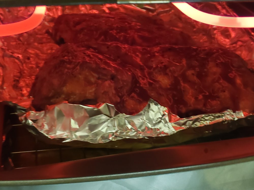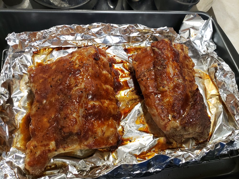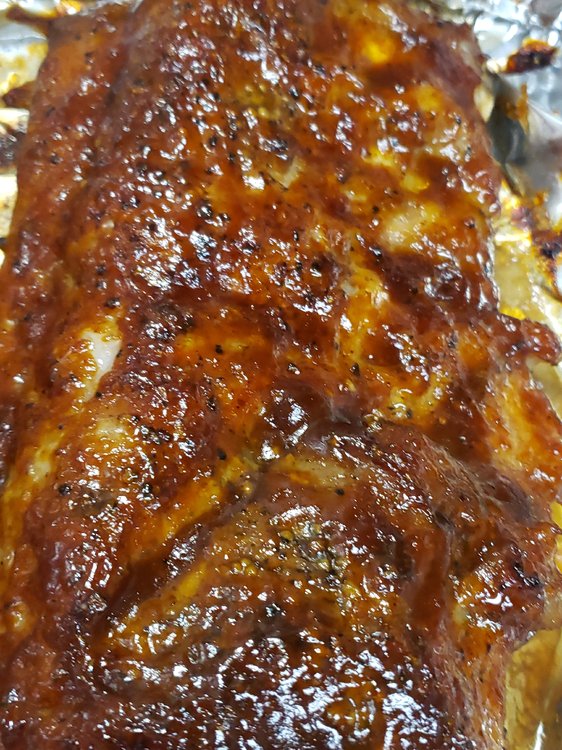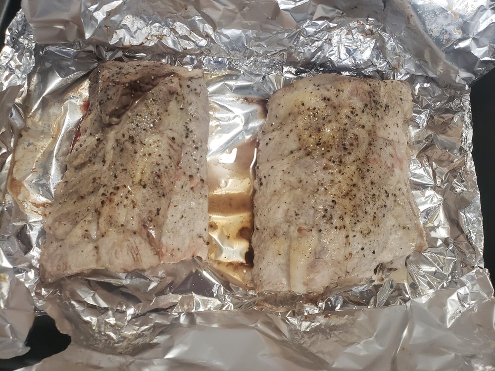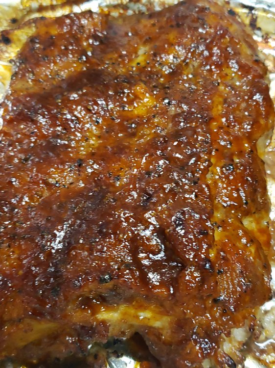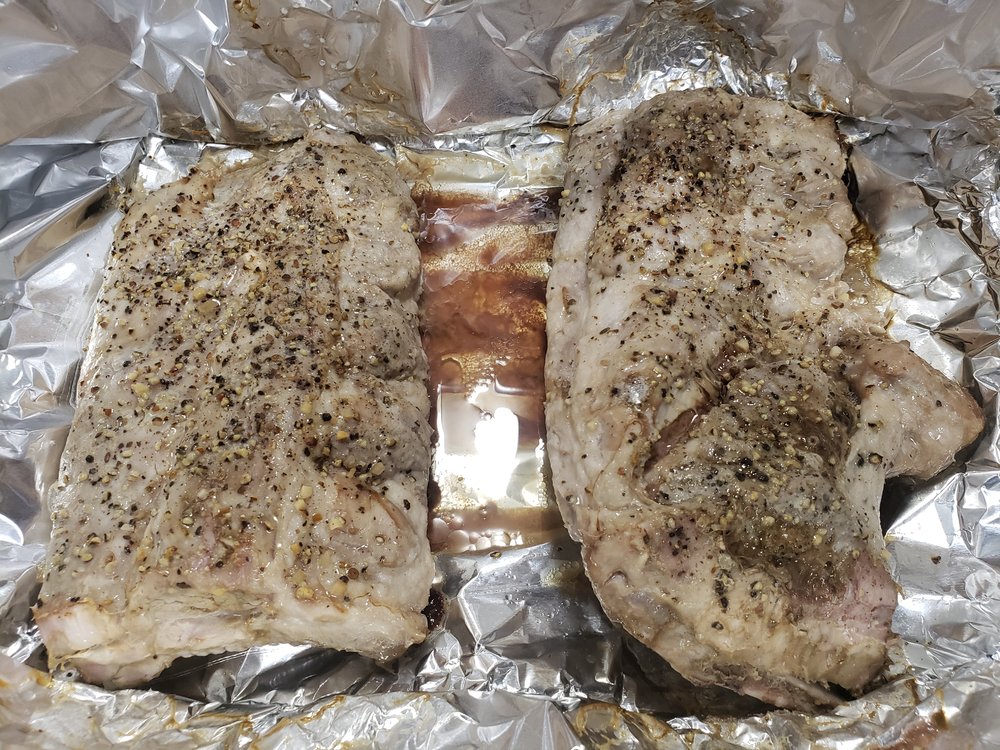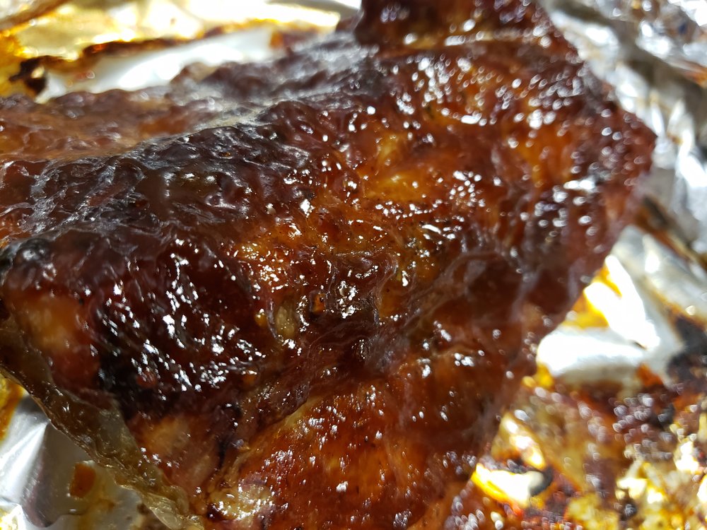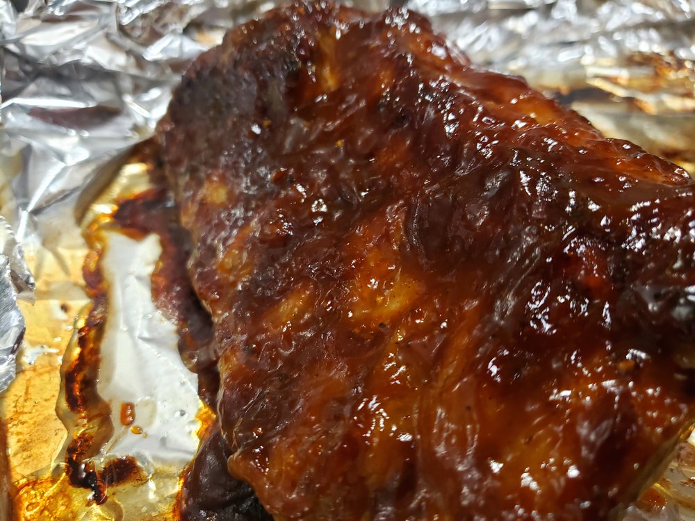 Freshly cracked Black Pepper, Kosher salt, a little Montreal Steak Seasoning. Wrapped in foil & baked at 250 for 3 hours. Sauced and placed under broiler, adding more sauce every 3 minutes or so as it becomes thick and bubbly.