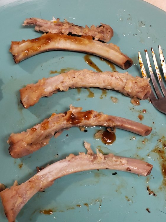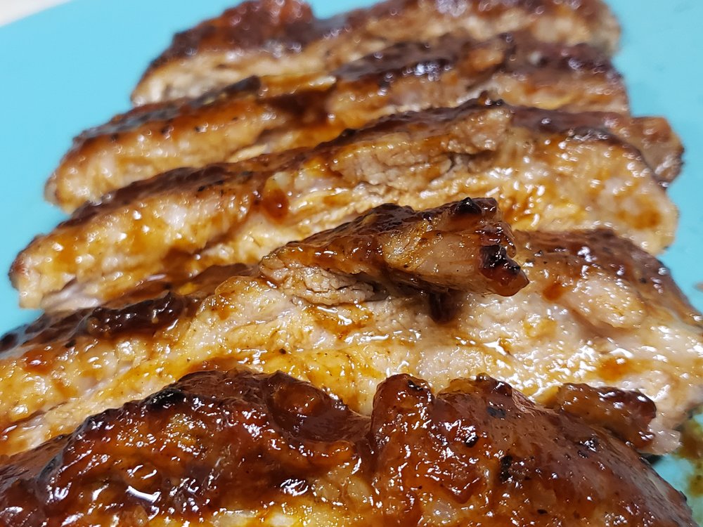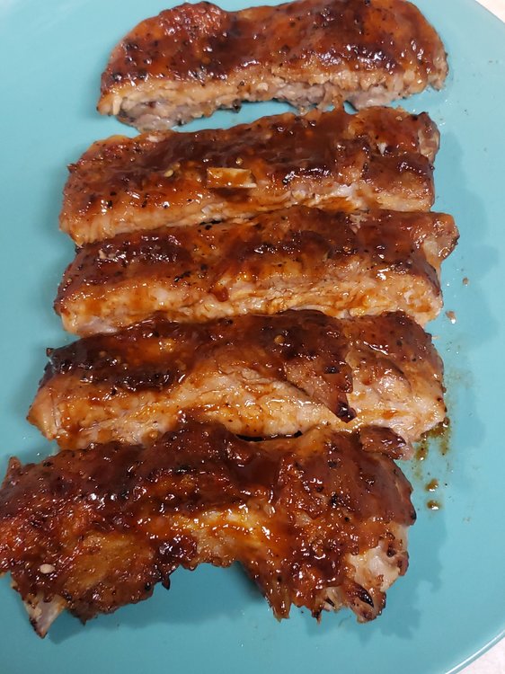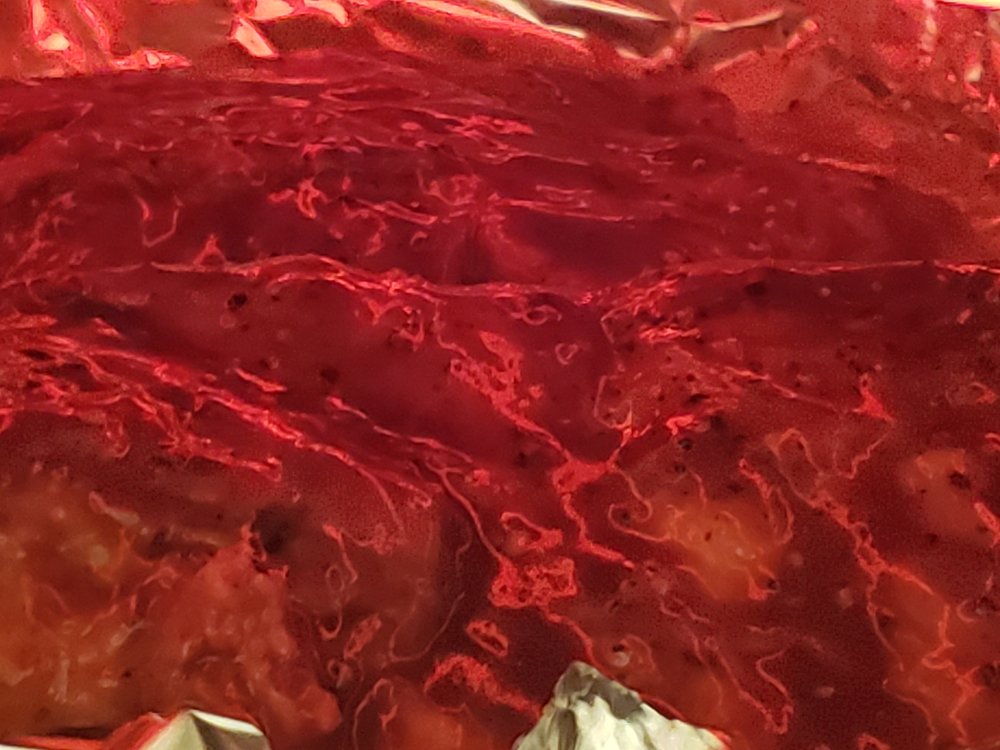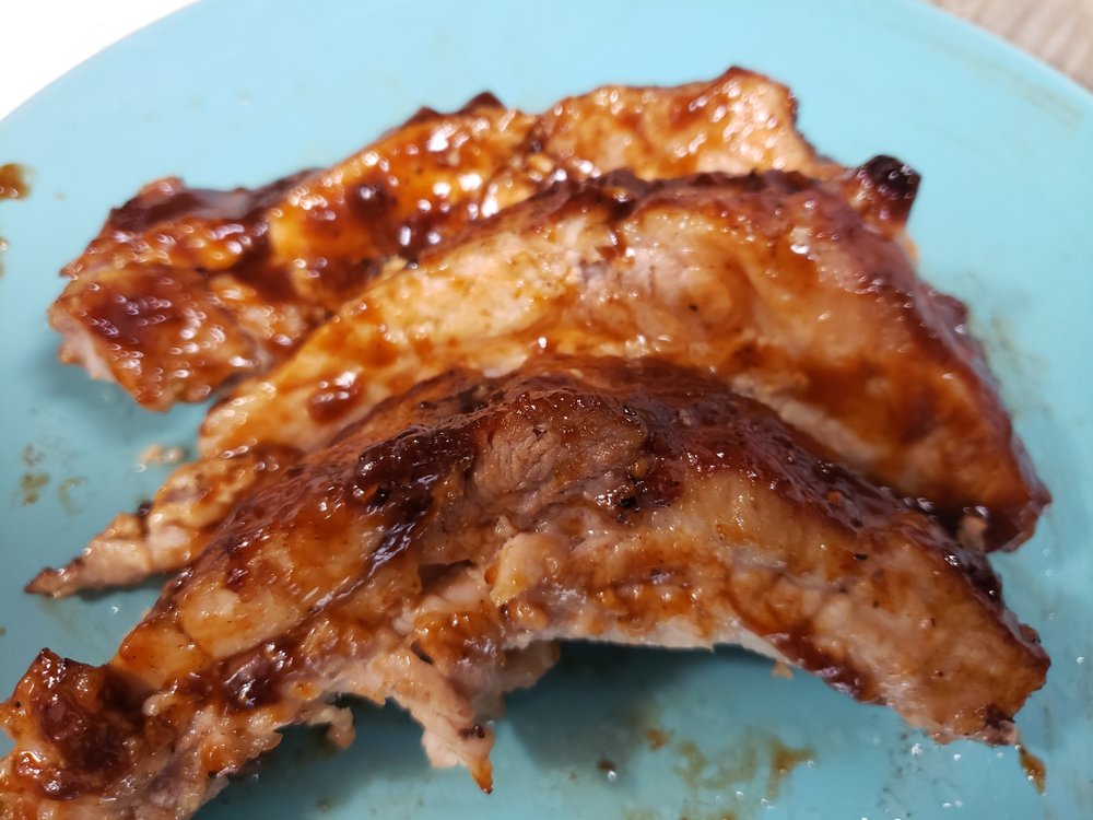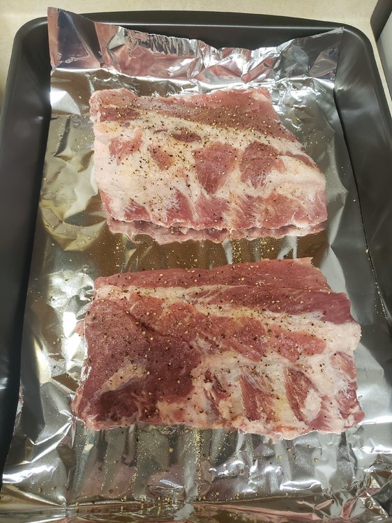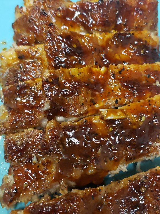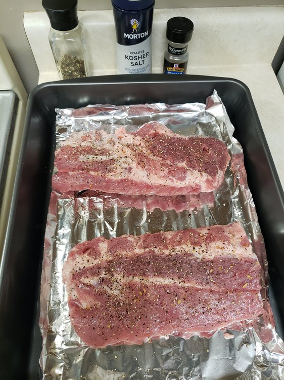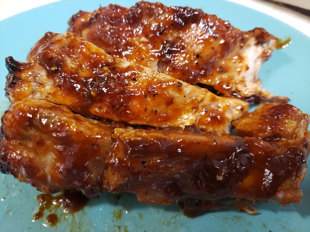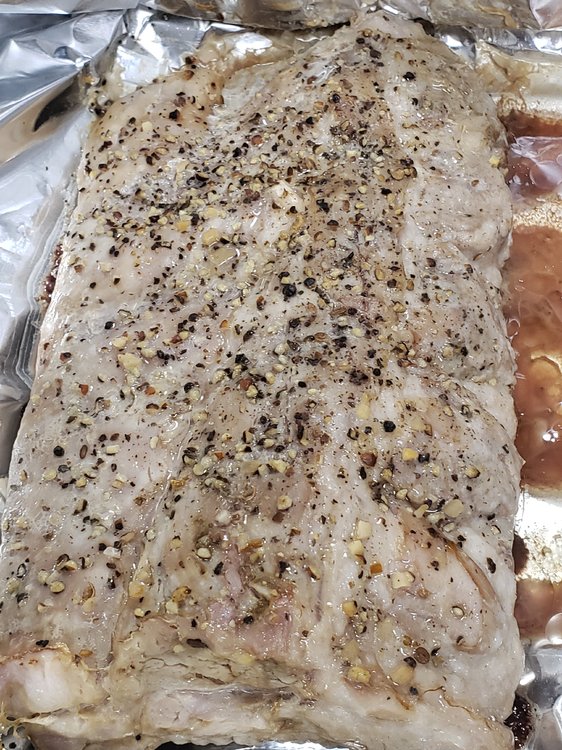 Freshly cracked Black Pepper, Kosher salt, a little Montreal Steak Seasoning. Wrapped in foil & baked at 250 for 3 hours. Sauced and placed under broiler, adding more sauce every 3 minutes or so as it becomes thick and bubbly.