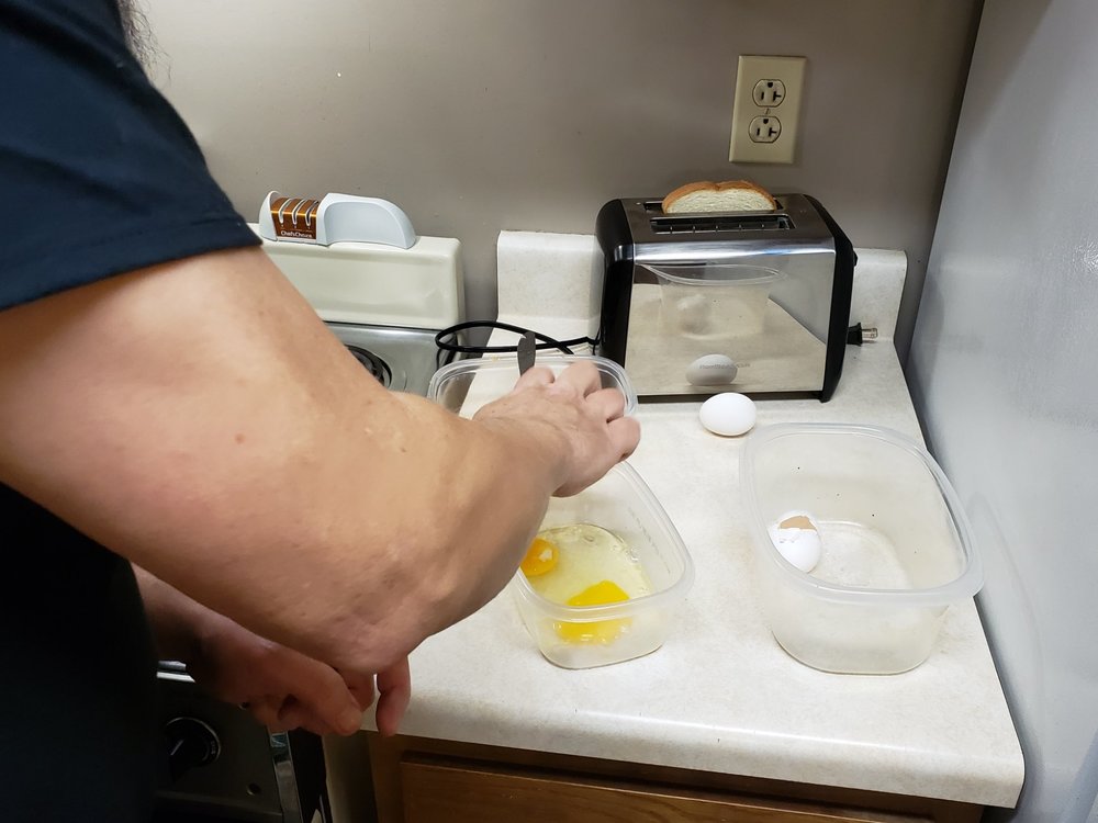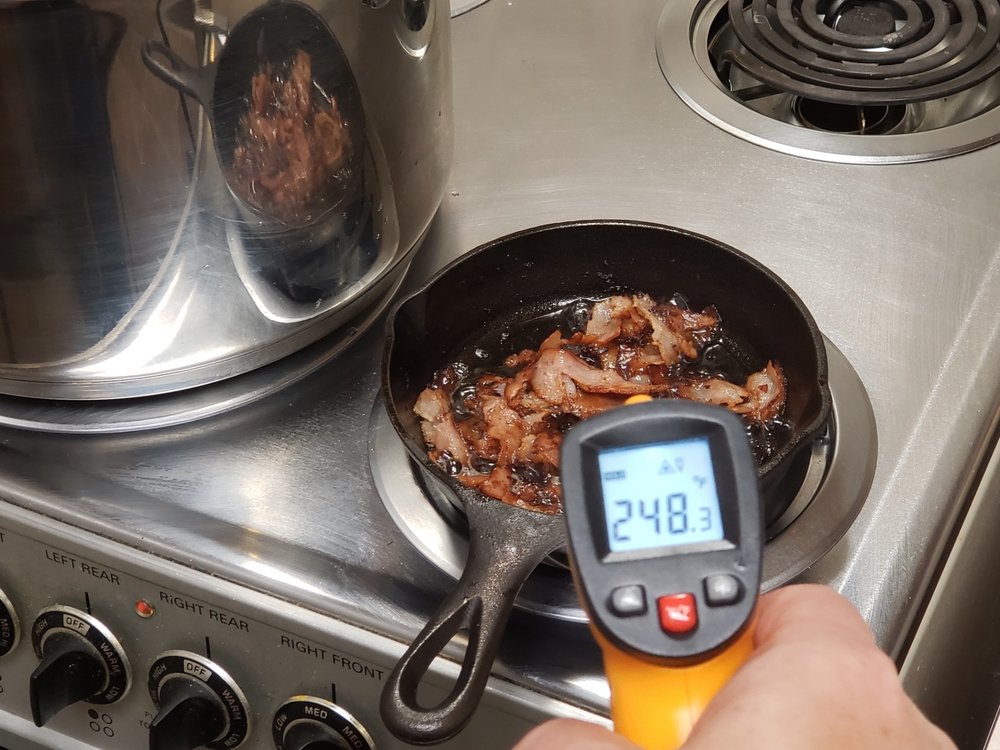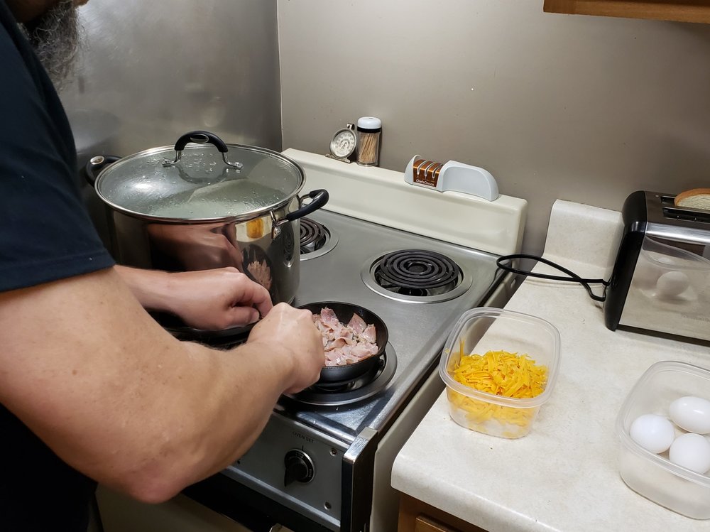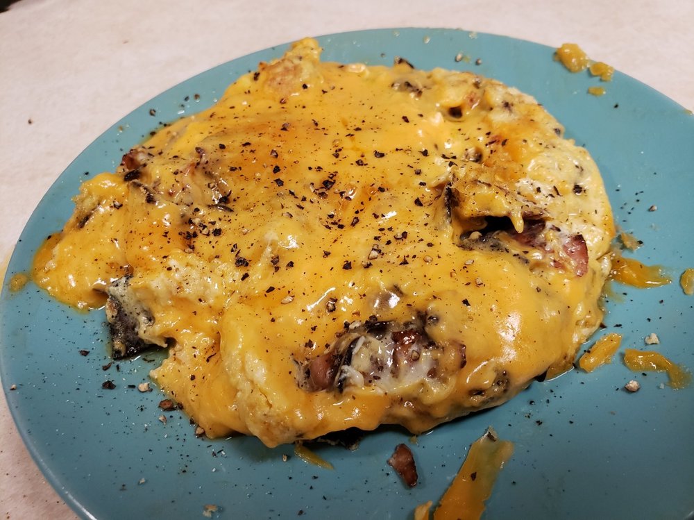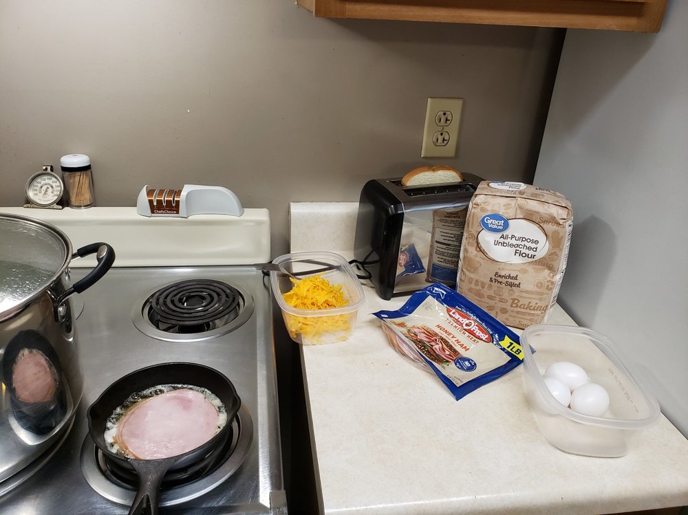 Too hungry to even think about onions; just was insanely hungry & yet took the time to record it... but not think of onions...could have well-sauteed them nicely, along with the honey ham, which had a considerable amount of water, which managed to bring my cast iron pan down from 430F to 130F in a matter of a minute, thanks to all that evaporating water....which would be great for a situation where you would like to employ the steam driven from the ham or onion...but, together would have extended the wait time at least double what it was with the over-watered deli ham....perhaps I intuited this situation from experience... or just dumb luck. Either way, I hadn't eaten all day...consuming only shitty soft drinks; & water to stay hydrated, so I was all about getting that mass of yum in my face!