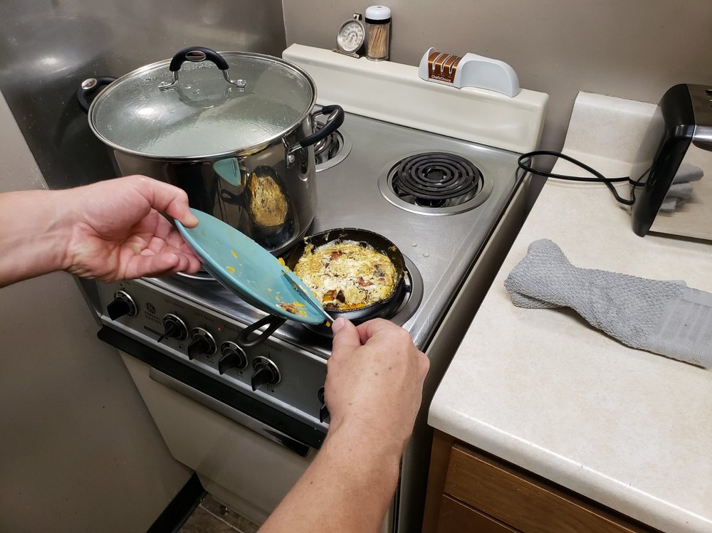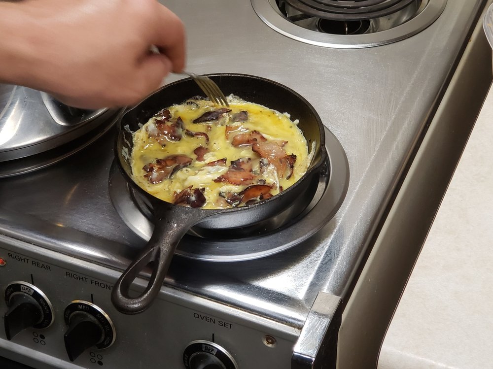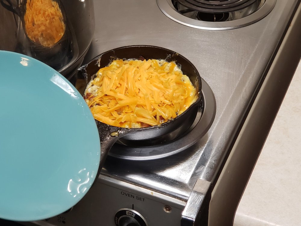 Gotta fill-up before I r0ll out: LOve the ease of work in cast iron; no need to worry about being delicate, can transfer to oven...use over a campfire... Can't stress enough the consummate utility of Maillard in all things culinary Medium-high heat & stir until just set; ~20 sec. glorious cheeeeseeee!!! Flip over to allow cheese to participate in Maillard action... ....aaand flip back over to plate...