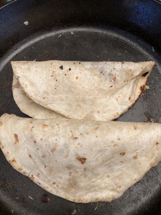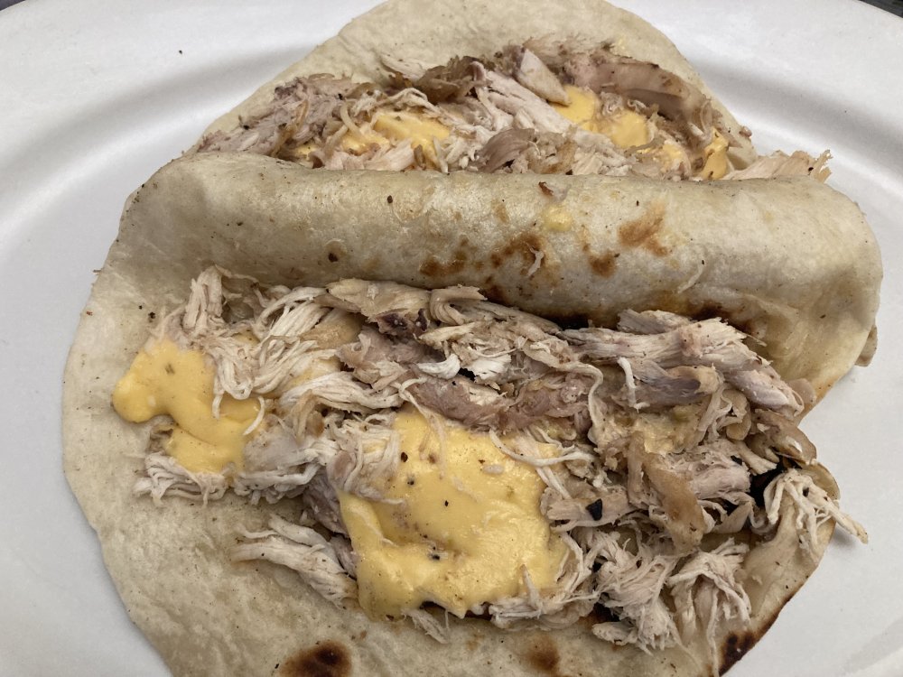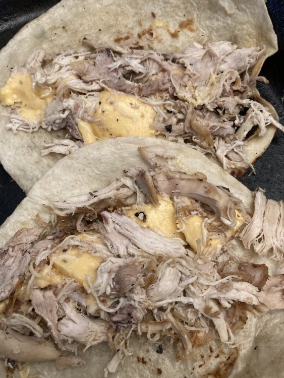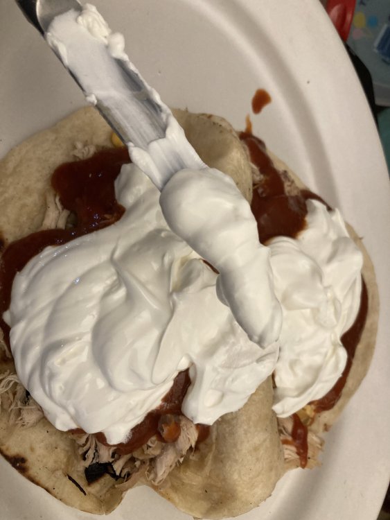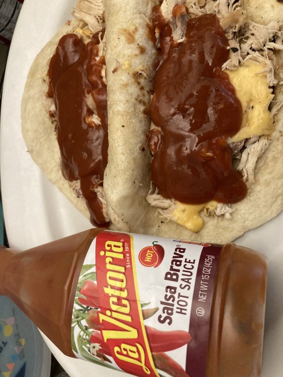 7. Sorry No sloppy Cheeseburger tonight but It's coming. I bought 7 rotisserie chickens for $35 early this month which for food prices today that's the Hack. 7 already cooked chickens for $5 a piece and it's been great. Can't beat the prep and server time which usually is grabbing a cold chicken and eat it. One chicken last I for 3 days and 4 days for my dog. idea one... Rotisserie Chicken Cheese Tacos Prep time and cook time was about 10 minutes but I was goofing off while cooking so it could have taken much longer. Heat up some corn or flour tortillas. Heat up the rotisserie chicken. Add authentic Mexican style Velveeta cheese (hahahaha) or whatever cheese you have, then melt it in. Fold so it looks cool for the picture. Closeup on the plate before smothering it with love. Add your favorite hot sauce, be liberal for once only. Then top with with just a touch of sour cream. Be a bit more conservative here than I was. My knife slipped a few time. Make mine, Sour Cream Smothered Rotisserie Chicken Cheese Tacos Then eat... be fat and happy till next time.