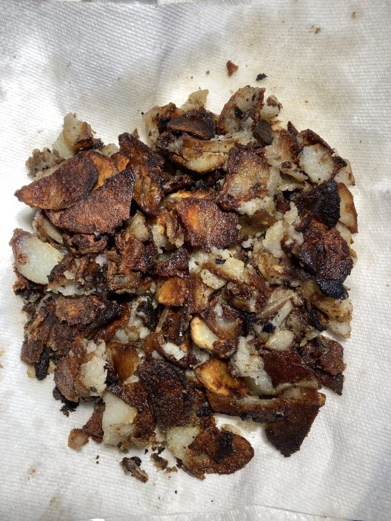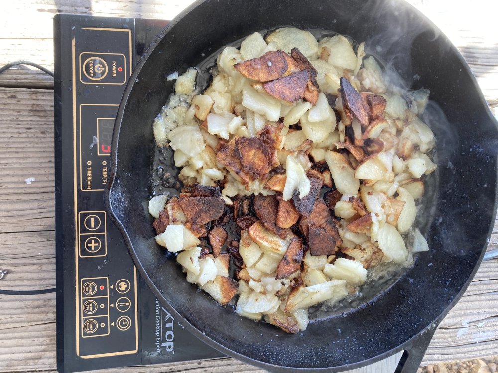 12. German Potatoes minus the onion cook in lard. Was going to make Curry Ketchup but stuck with regular turning them into French Fries or Chips. I cooked in a Cast Iron skillet using my cool Induction cooker making this a very healthy meal. Iron makes it all better. I was going to make the Cheeseburgers but ended up diving into the potatoes instead then passed out before Sunset. Woke up at 11:30PM yesterday been up since... so I'll cook the burgers tonight.