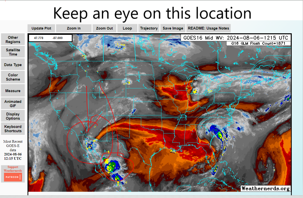 Keep an eye at these locations... https://www.weathernerds.org/satellite/?initsatsrc=On&initsatname=GOES-E&initsattype=wv&initcscheme=ir1&initimdimx=1050&initimdimy=630&initrange=55.000:-130.000:20.000:-60.000&initloop=False&initnframes=20&initlightningge=On&initlightninggw=Off&initltngfed=Off&initltngtoe=Off&initinterstates=On&initwarnings=On&initlatlon=Off&initascatb=Off&initascatc=Off&initascatambb=Off&initascatambc=Off&initsst=Off&initecens=Off&initgefs=Off -