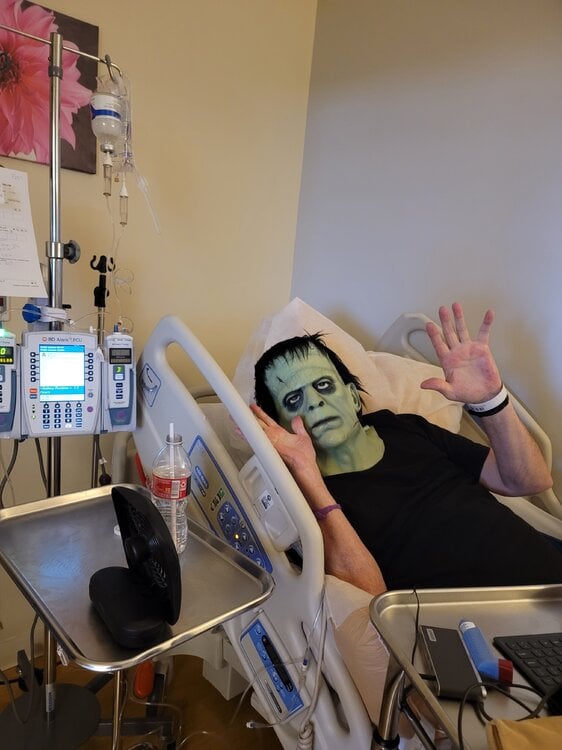 Hi everyone. djMot here posting on behalf of DunksFrag who isn't feeling great but wanted to get these pics out to all his >XI< friends. As those of you who know him already know, Dunks has a particularly aggressive and seemingly incurable form of cancer. He often needs "infusions" - of just what, I'm not sure, but it sure seems like a soul-sucking event every time he has to go through another round of the stuff. Infusions are only part of the regimen he must endure. So if you have a moment to send a prayer his way, he could surely use them. The first pic is from a couple of days ago while receiving his latest infusion. Always making the best of a situation and joking around. Like one of his favorite jokes he loves to tell about the time his doctors told him, "Frank, we don't want you lifting anything over 5 pounds." Frank: "But doctor, how will I pee?!?" The second pic is the massive 9.5 foot spider he recently bought through Home Depot. He wanted to get it up on the roof but couldn't figure out how to get it up there in his condition. HAPPY HALLOWEEN from [>XI<]DunksFrag!!!