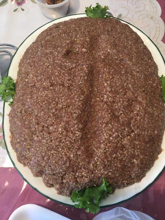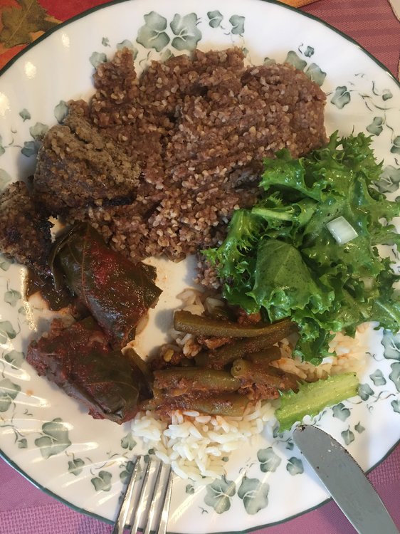 Here is another Lebanese dish called Kibbie or Kibby. We eat it RAW or cooked. I ground my own meat. I mostly use beef eye of the round in the Middle East lamb is mostly used. I remove all traces of fat, grind the meat twice. For every pound of meat I wash and soak 1 cup of cracked bulgar wheat. While the wheat is soaking I purée 1 onion per pound of meat. To the onion add salt pepper mixed spice all spice cumin cinnamon and mint. I then add the the onion and spice mix to the CHILLED MEAT. I drain the water from the wheat. Using my hands I squeeze as much water out of the wheat as I can. Add the wheat to the meat and mix thoroughly. Let the kibbie stand in the fridge for about 30 minutes or until the rest of the meal is ready. Put the Kibbie on you plate pour olive oil over it and eat with pita bread. I’ve added pictures showing raw and cooked Kibbie. The cross on the Kibbie signifies our Christian Heritage. My family used to me Maronite Christians from the mountains. You can also see Lebanese string beans in meat and tomato sauce and grape leaf stuffed with rice meat and tomato sauce.
