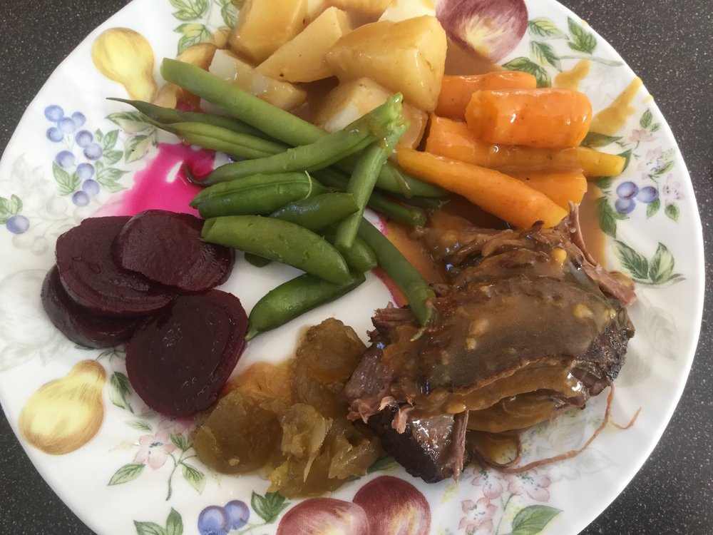 Plain old Roast Beef, Garvey and fresh garden vegetables from my garden. Even the green Tomato chow preserves are from my garden.