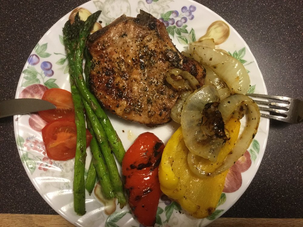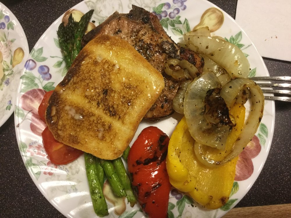 BBQ pork chop and vegetables. We love the BBQ in Canada 12 months a year. Can’t forget the home made bread.