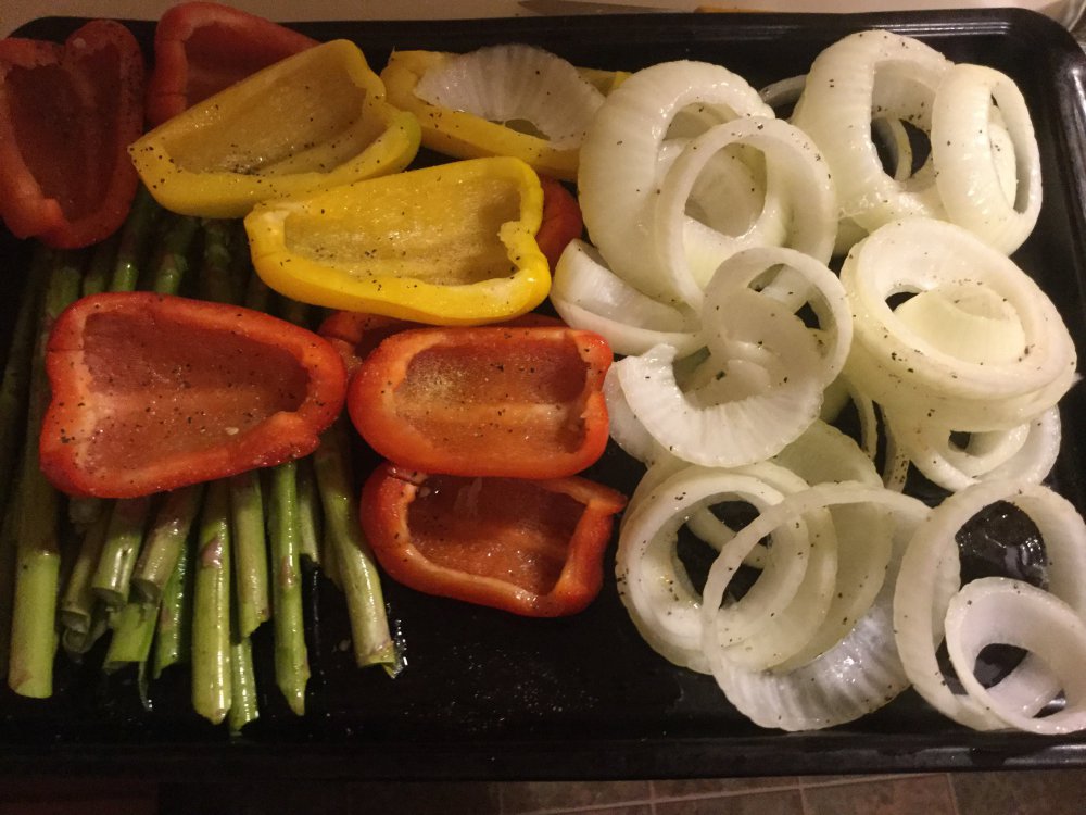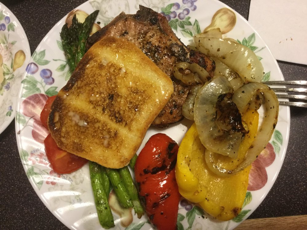 I love grilled peppers! Try some grilled asparagus too. I also grill sweet onion rings. Before I grill my veggies I toss them in a bag, poor oil over them, season with salt, pepper and garlic powder. Mmm Here is a plate with pork chop, veggies and my home made bread! -
