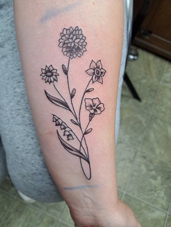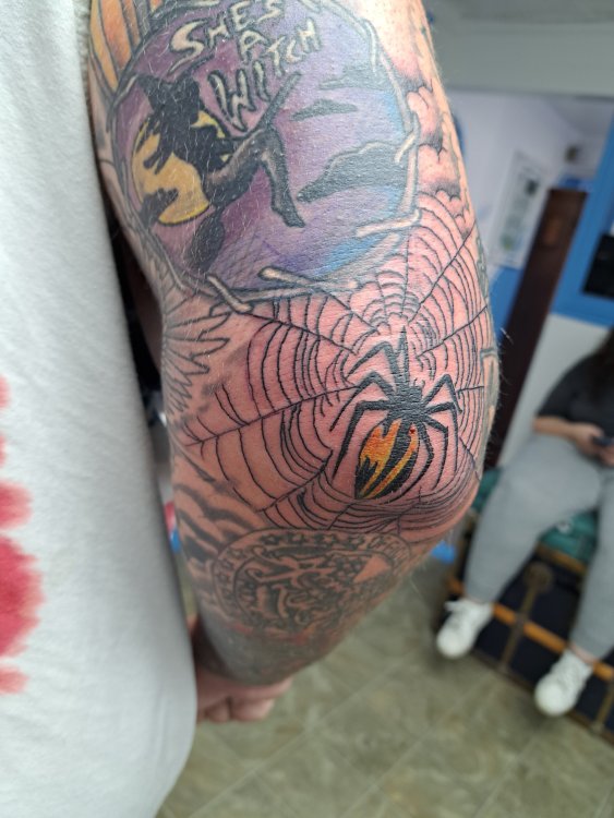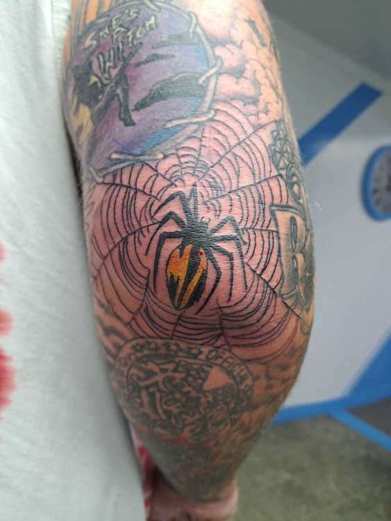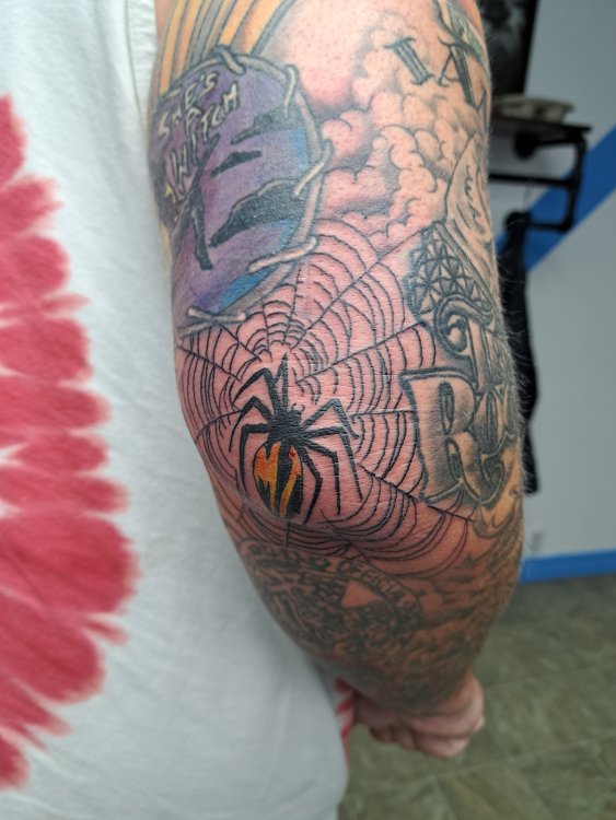 Finished off my full sleeve today! My whole right arm is tattoos dedicated to my fav band and good friends Monster Truck. Had a spot left at my elbow, so, asked the lead singer of the band to draw something to go in there, so he drew me up a spider web and spider and the spider has a MT on the body for Monster Truck. Fit in perfect!!! Then to make day even better my Daughter came with me and got her 2nd tattoo. A bouquet of 5 flowers, each one being one of our birth flowers, an idea she came up with on her own! Then we went out for a nice dinner after. Was a great day!!!