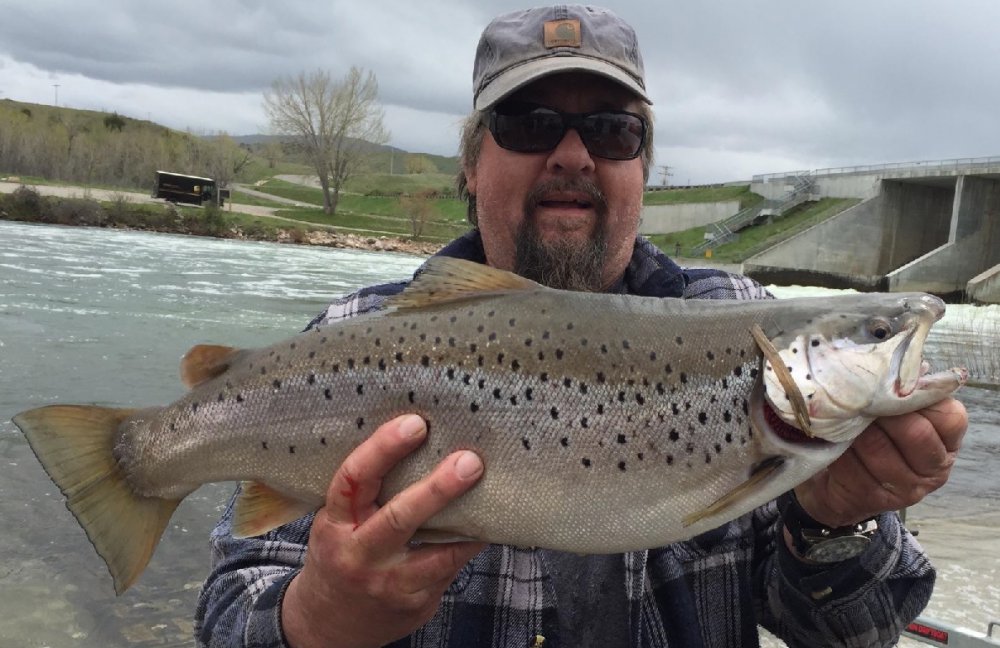 We have had a very wet winter and snowpack is still 165% of normal. Normal flow this time of year in the river is 4,000 -6,000 cubic feet per second (CFS) this year its 13,000 CFS and may go as high as 17,000 cfs. Because of the massive volume of water being released from the dam the river is getting stocked with fish from the lake and I think this "fattie" washed down . Trout in the river are generally more slender.