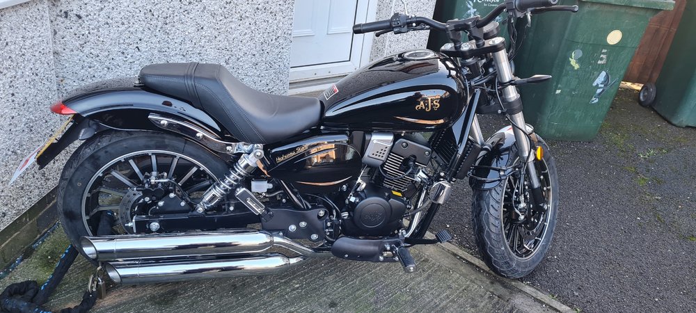 Yes the AJS name was purchased by a chinese company years ago then they eventually partnered up with Honda for the engine and an ex Harley designer, they used to be unreliable a few years ago but they have improved greatly and I must admit it is a very nice ride, not the fastest because it is a heavy bike but for a 125 it will do 70 mph and its more than enough for me to get around town and the odd trip to Coalvile (Leicester) to see my parents.