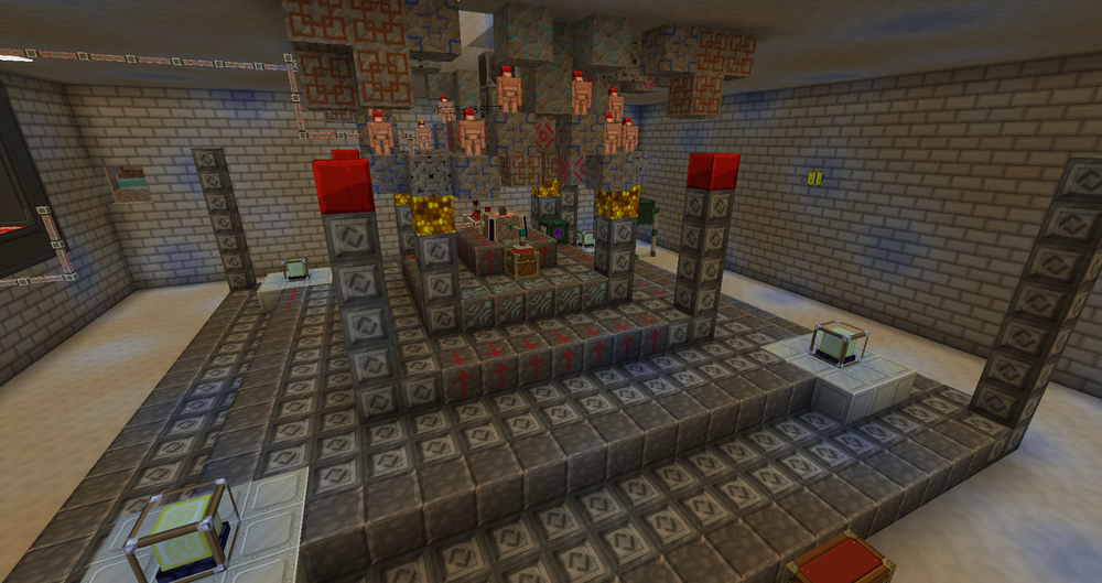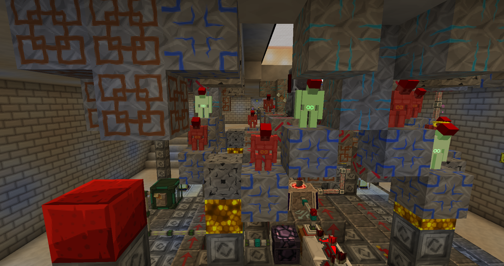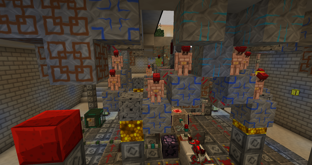Life Essence is the primary resource in blood magic. By using Thaumcraft a mage can create Acolytes to sacrifice blood for their nefarious work. In the above image, you will see Flesh Golems from Thaumcraft. Flesh Golems coupled with Fezz's can withstand Blood Magics Ritual of Sacrifice. To acheive the perfect balance you will need two rituals active Ritual of Sacrifice and Ritual of Regeneration. The green on the golems above are the effects of the Flesh Golems regeneration. The ritual takes one heart at a time but the passive regeneration along with the rituals regeneration heals the golem before the ritual of sacrifice can take another heart. Currently i have 54 Runes of Sacrifice on my tier 5 altar. Every tick of the Ritual of Sacrifice i gain 1k life essence. This with seven Runes of Speed refills the life essence before an item can consume it. Therefore creating an endless loop of Life Essence. To refill the Life Essence consumed by the rituals, i pump out the excess Life Essence into a Mekanism Dynamic Tank. From this tank i can fill another altar and place an Orb in it. Keep in mind that the orb will only fill to its cap. You cannot use a Master Orb on a tier one blood altar and reach 1 million Life Essence. However and apprentice orb in your second altar will keep your life essence from reaching zero. Not to mention it makes you altar seem far more sinister as now you have acolytes to assist you in your rituals!