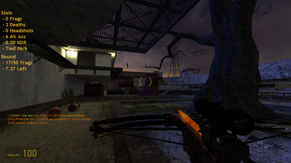 I wish we had a Half Life II Deathmatch server...they are a lot of fun, especially Pirates Cove, they have everything cranked up, like an Ace Mod server...I know there's a lot of work to stating a server, and I don't know much about it...put I have a lot of fun in here...low gravity, that crossbow, the gravity gun, unlimited energy to run, unlimited ammo..