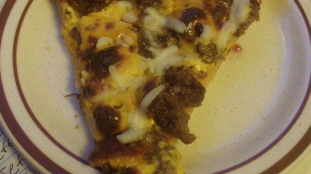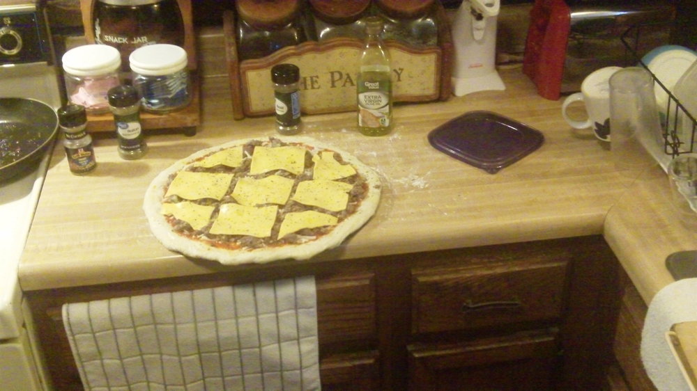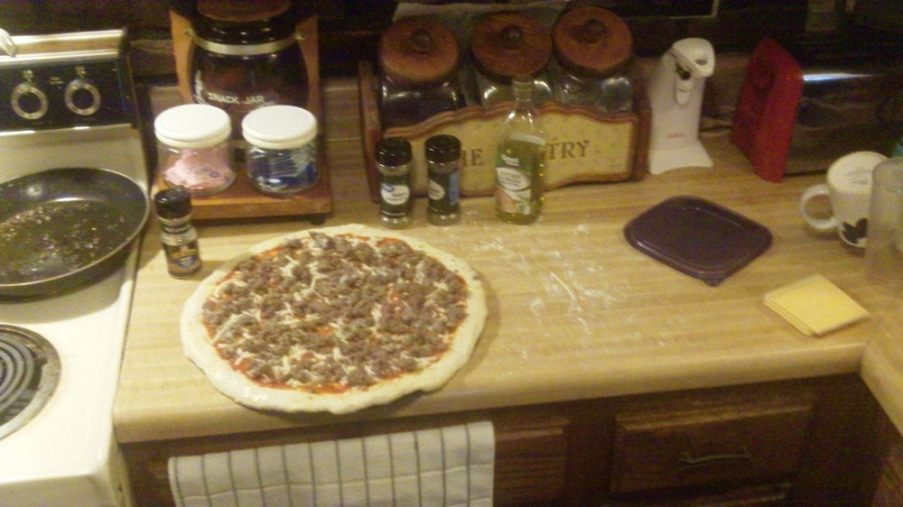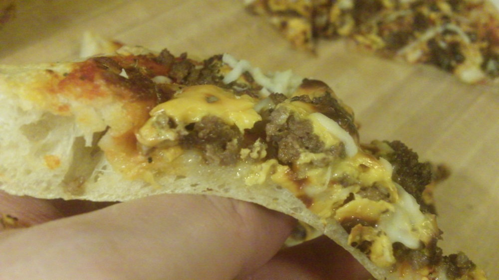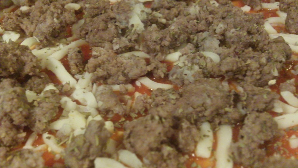 Ground beef seasoned with Chicago Steak Seasoning; added Italian Seasoning, Basil. Crust brushed with garlic-infused olive oil. Pretty tasty. =) Dough was risen 4 times.