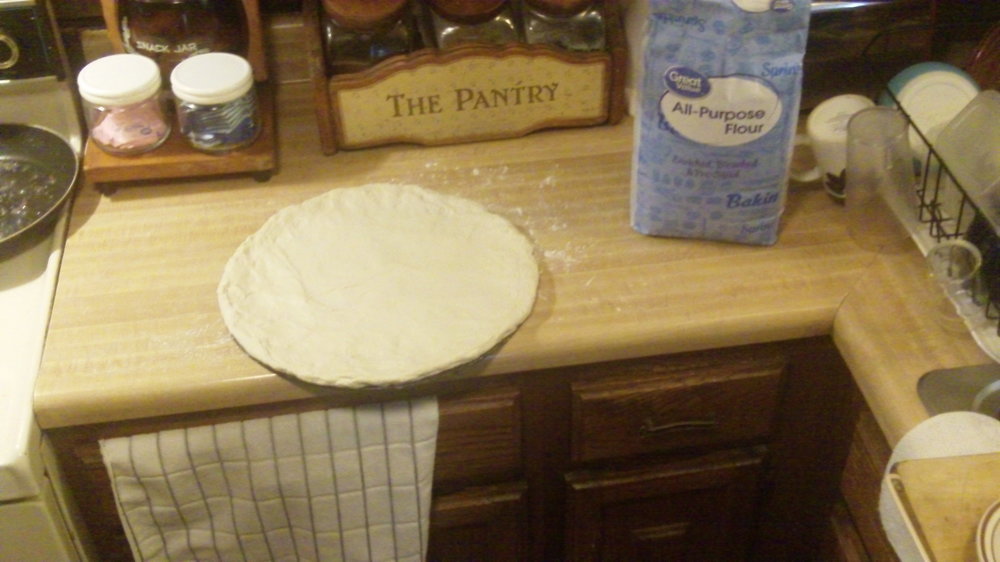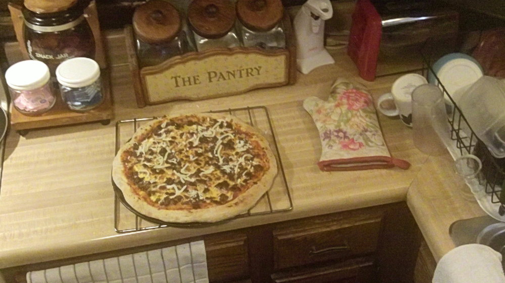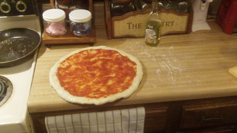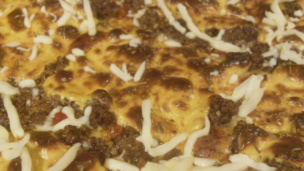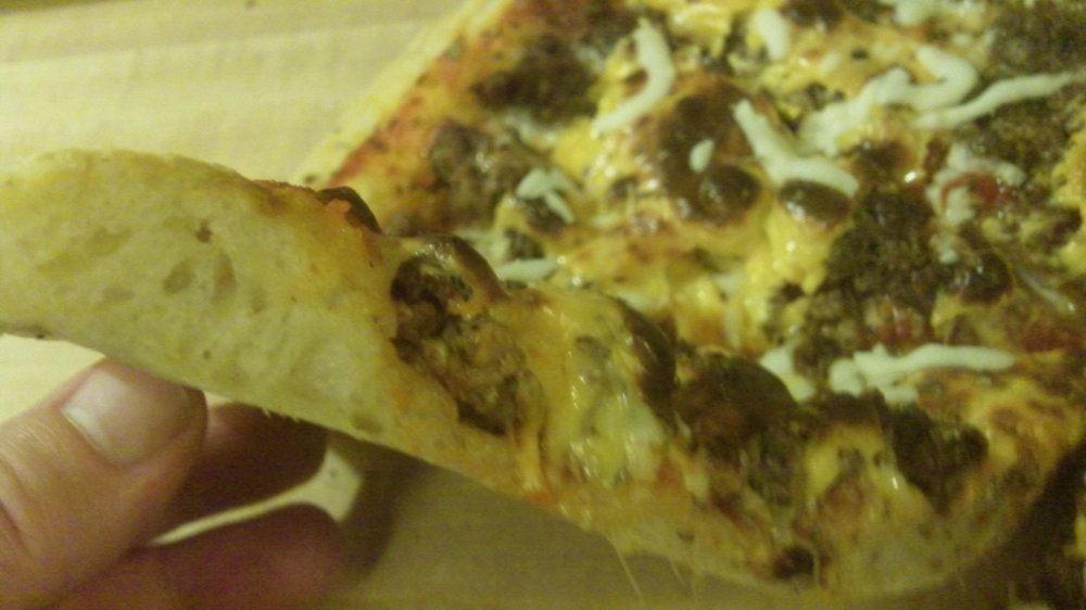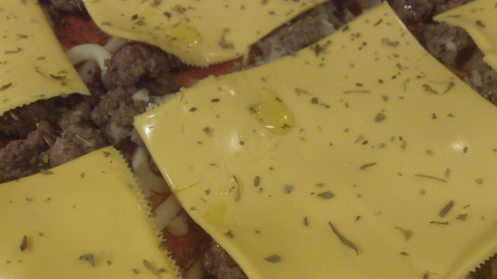 Ground beef seasoned with Chicago Steak Seasoning; added Italian Seasoning, Basil. Crust brushed with garlic-infused olive oil. Pretty tasty. =) Dough was risen 4 times.