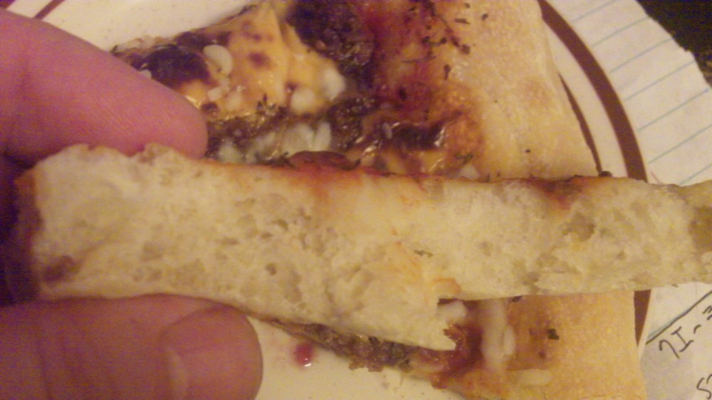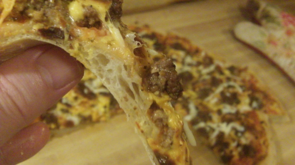 Turned out exactly as I like; You can tell the dough was given 2 days to develop in the fridge before being taken out to rise by the large air pockets in the crust and the airy consistency. =)